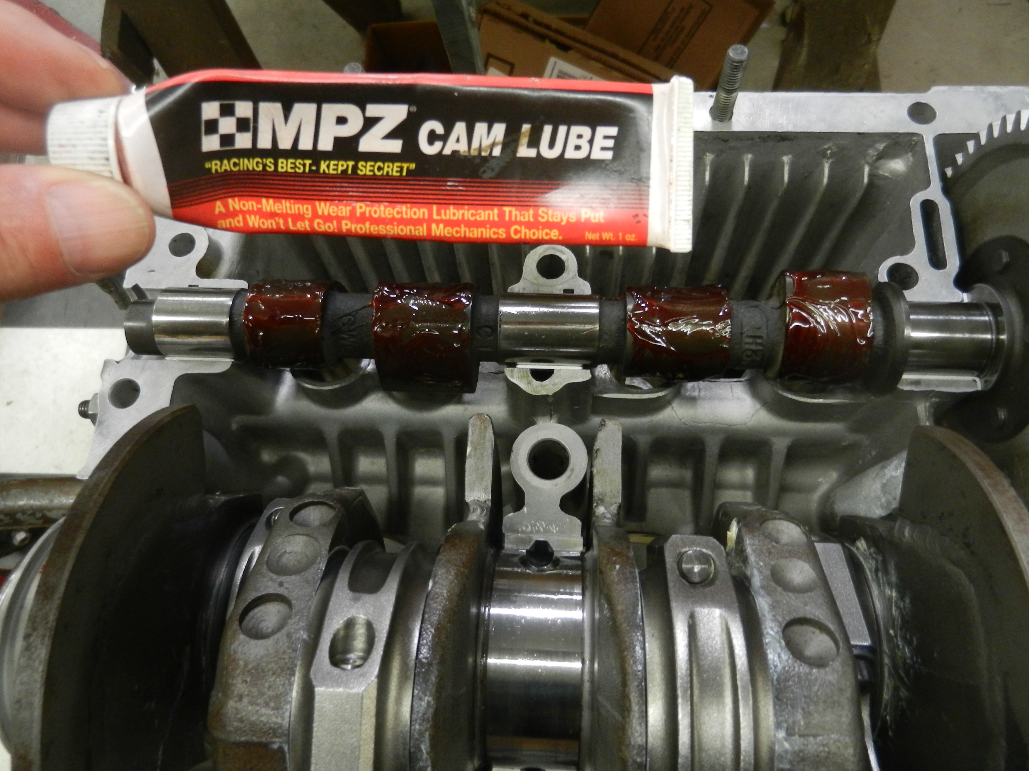 Smear some white grease on the gears. This helps cushion and lube things up until we get oil pressure when we first crank it over. Some cam lube on the cam lobes. In the "old days" we used STP for this. Wipe both case halves clean with a rag and brake cleaner.