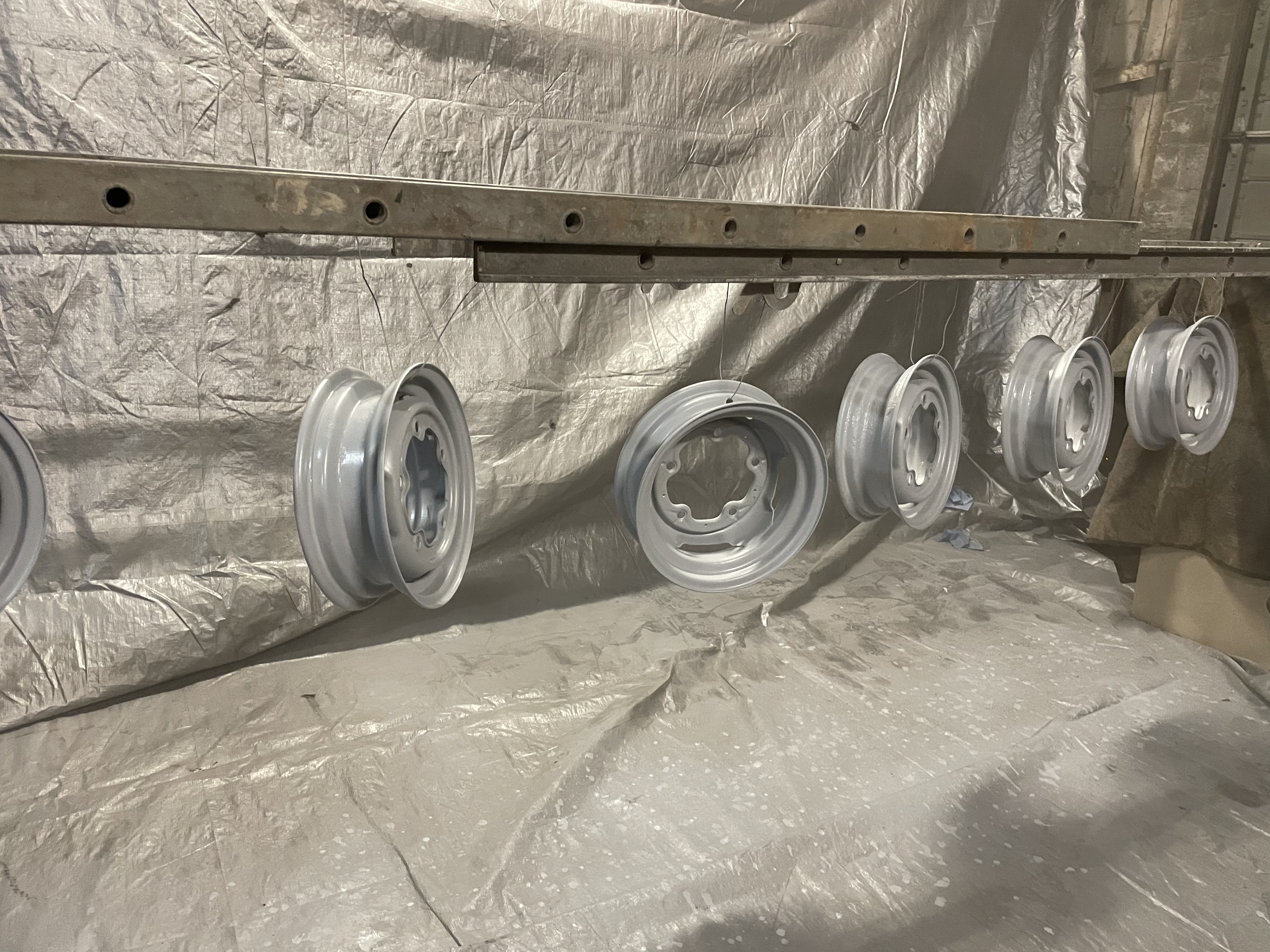 I put wheels on a turntable, lazy Susan or round stool and spin them while shooting to get a more even application. If you haven't mounted them on a front spindle and spun them to check for being bent, it's a good idea to do this first. I think I went through about 10 to get a set that ran true.