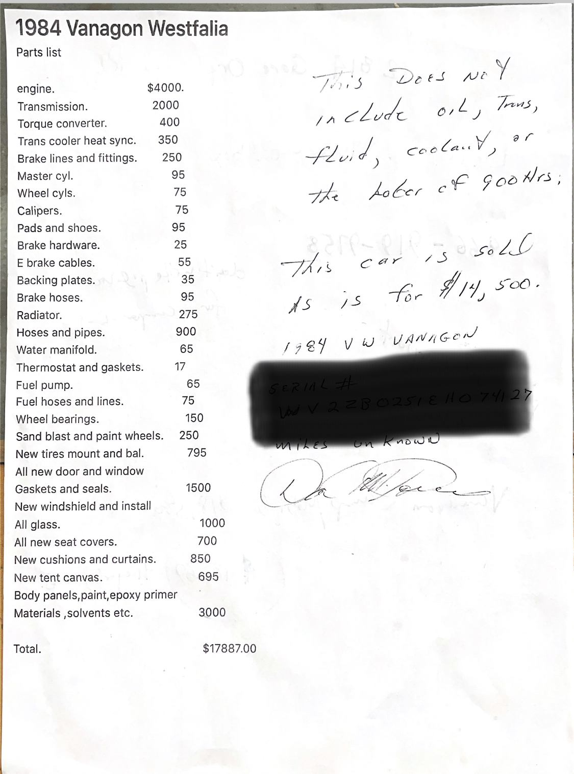 1984 VW Vanagon Westfalia SOLD