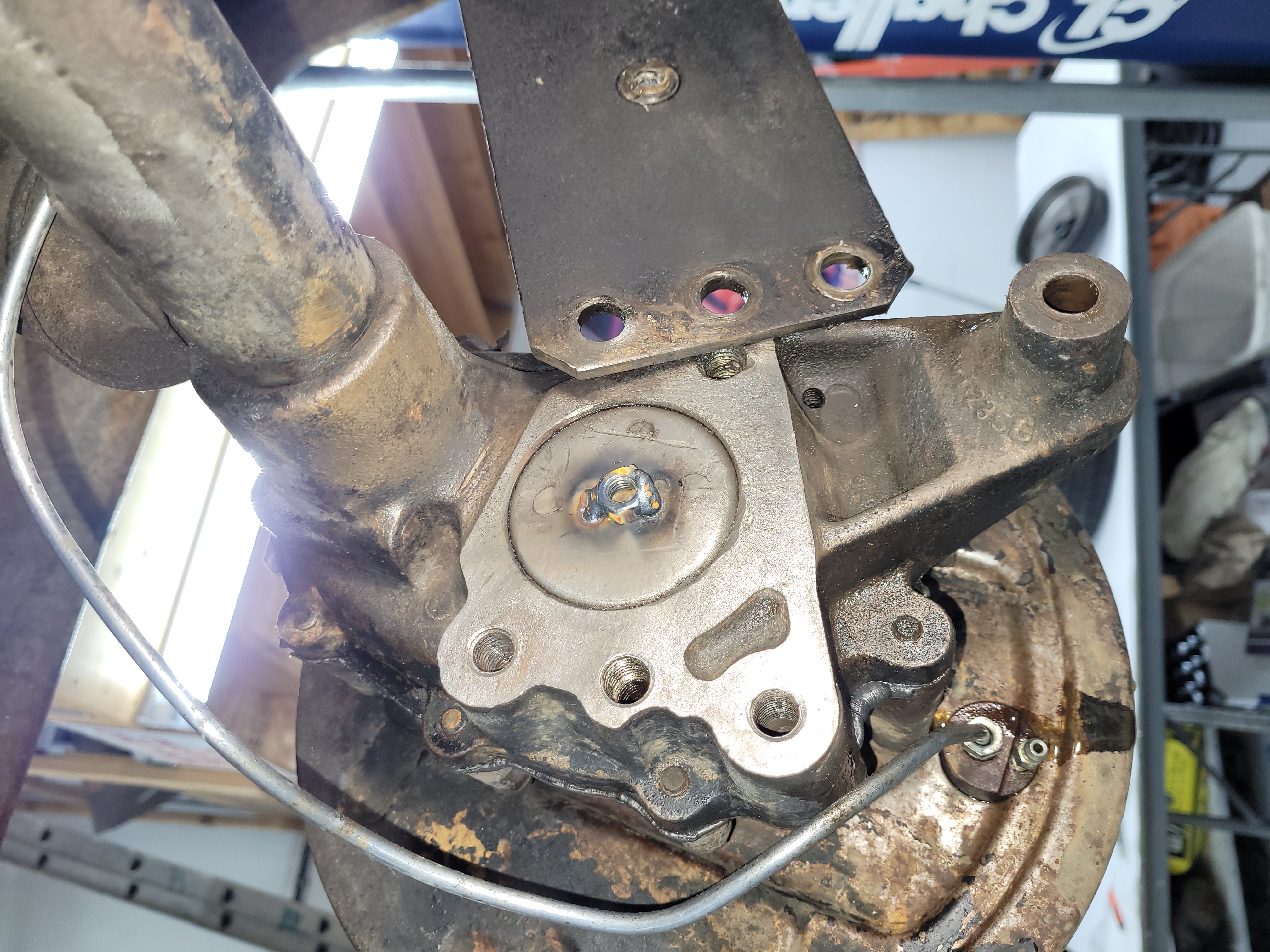 I chased all of the threads, replaced the messed up bolts, and installed the lock tabs and correct wave washer on the front bolts. Install brake line retainers and grommets. All were torqued to spec, 80 ft-lb.