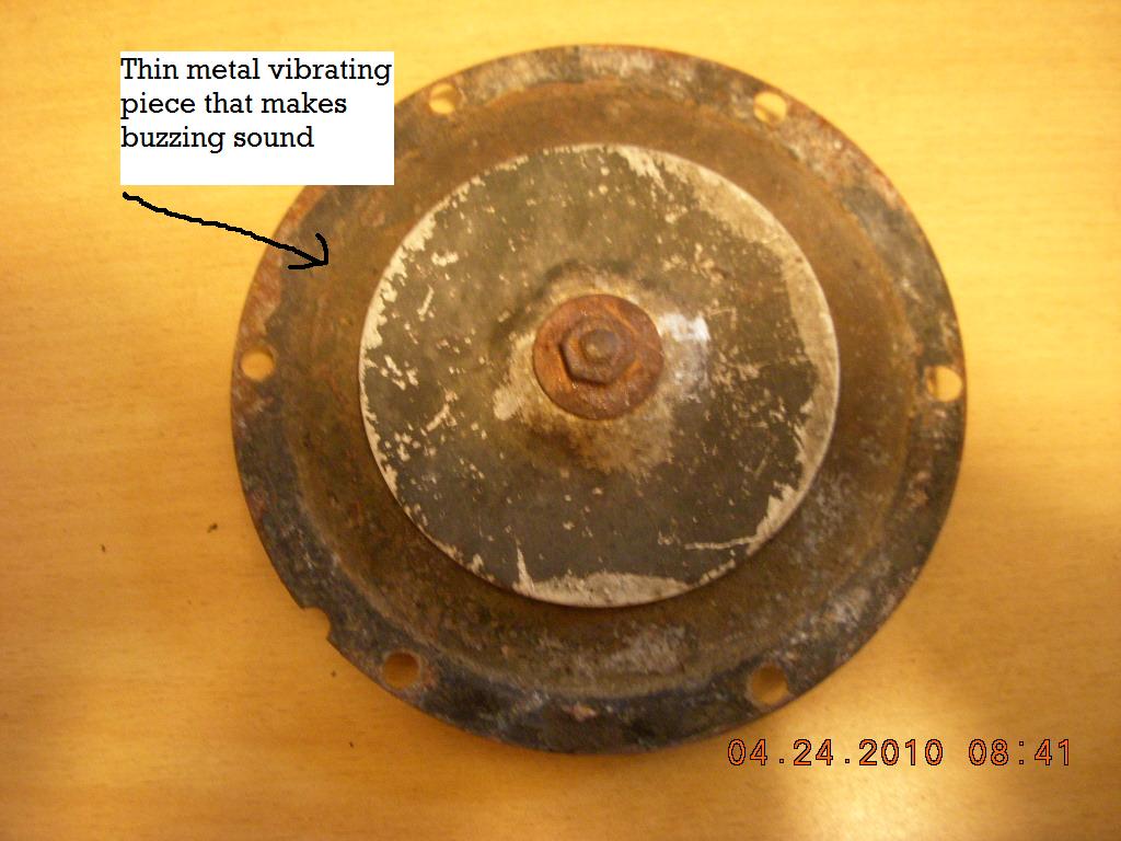 When power 6v or 12v is applied to the horn a coil pack is magnetized which causes the bar on the thin buzzer plate to be drawn towards the now magnetized metal block on either side of the coil pack. As the plate approaches the magnet it then contacts the tab on the point plate, which in turn breaks contact with the points turning the power off to the coil pack. This happens very rapidly causing the metal plate to jump back and forth shaking the buzzer plate and making noise/vibration.