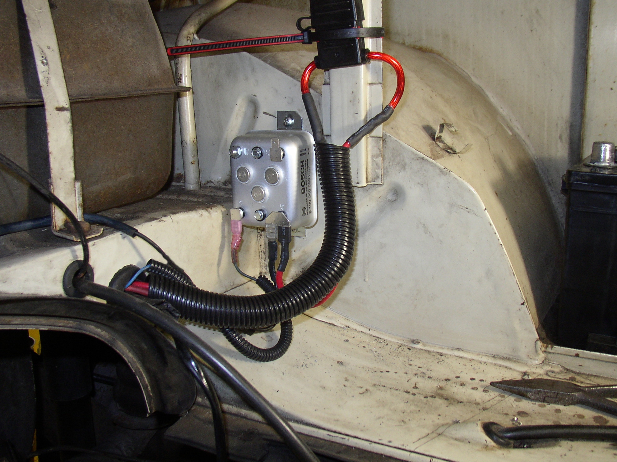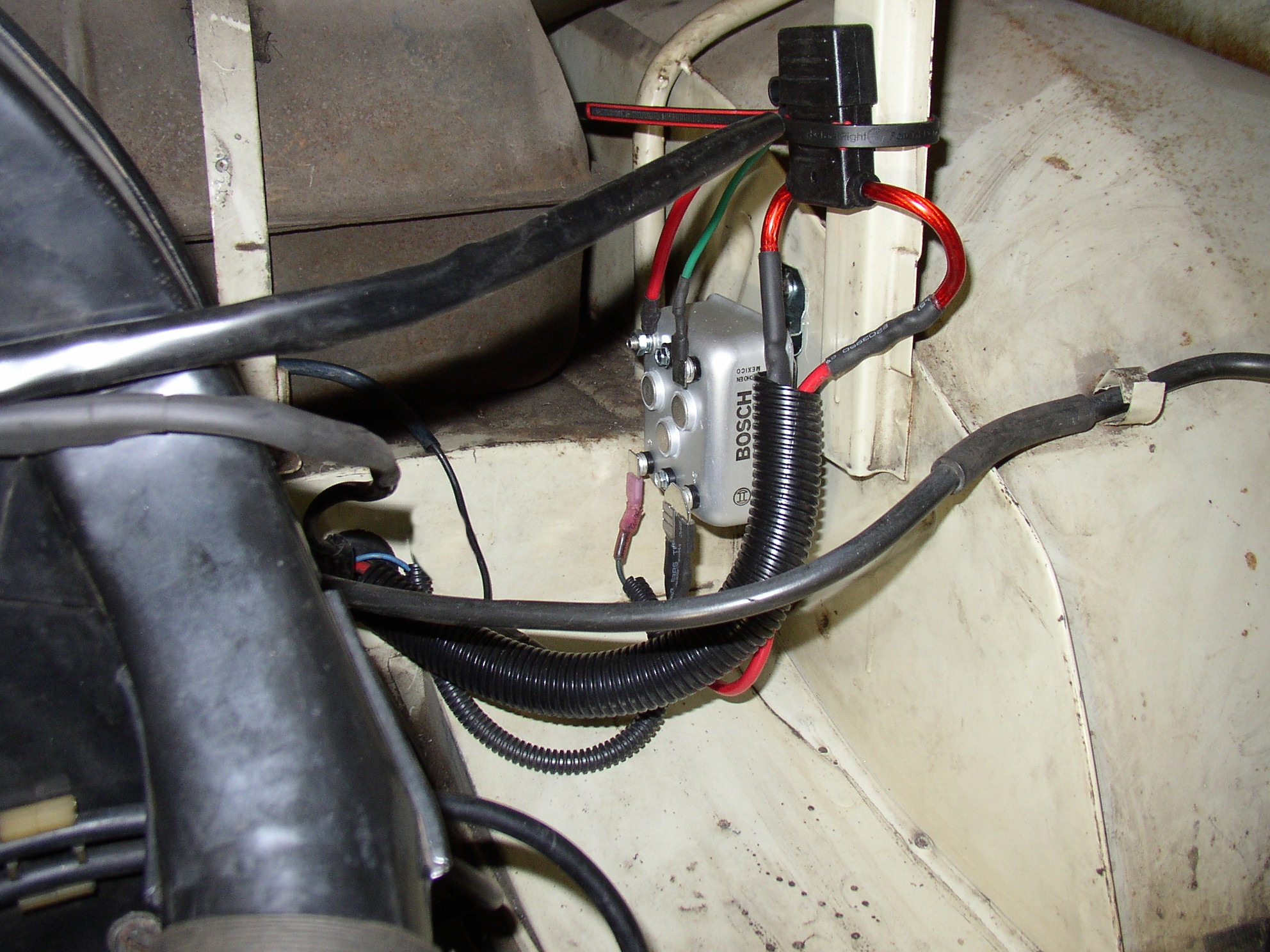 Here's the wiring prettied up on the regulator. Lots of splices here as the wiring was toast from heat and age, and every splice is soldered and shrink tubed. I installed a 40amp MaxiFuse to protect the 10ga hot feed going to the dash. If the ignition switch comes loose, or the headlight switch comes loose and shorts on sheetmetal, or the fusebox comes loose, this will stop the bus from burning. That's a rubber covered reusable ty-wrap holding the fuse.