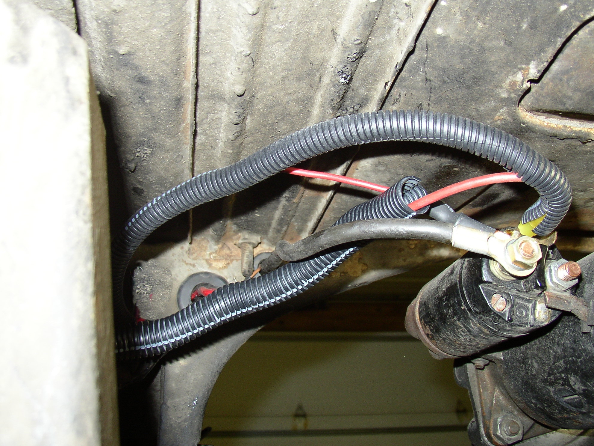 Let's pretty up things back by the starter. All new terminals here but the main power feed is hidden by the battery cable. It has 2-10 gauge feeds soldered and shrink tubed into a copper eyelet, better than OE.