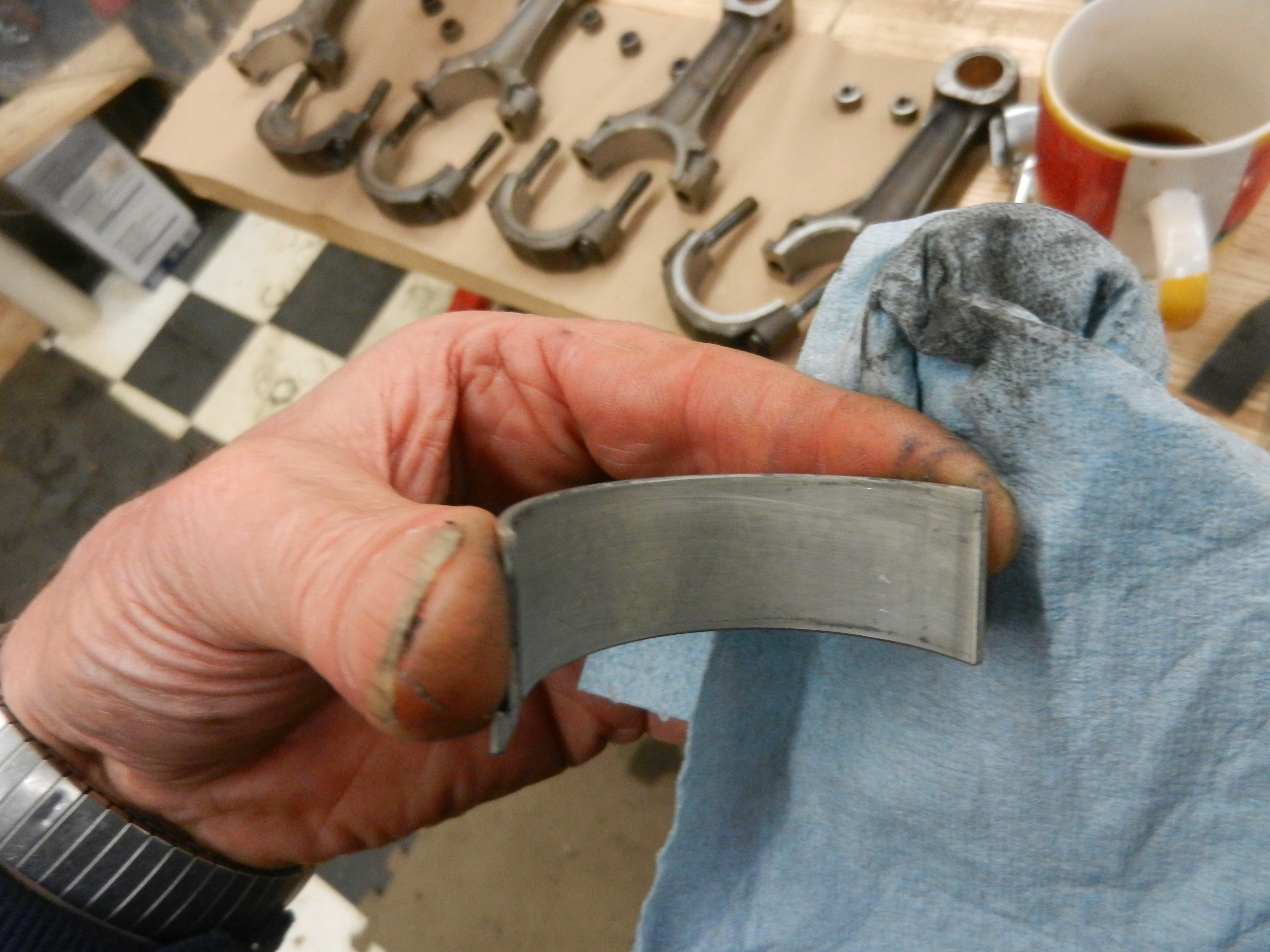 Now we are going to hang the rods for some measurements. First, wipe the bearings,rod big end and rod journal clean.