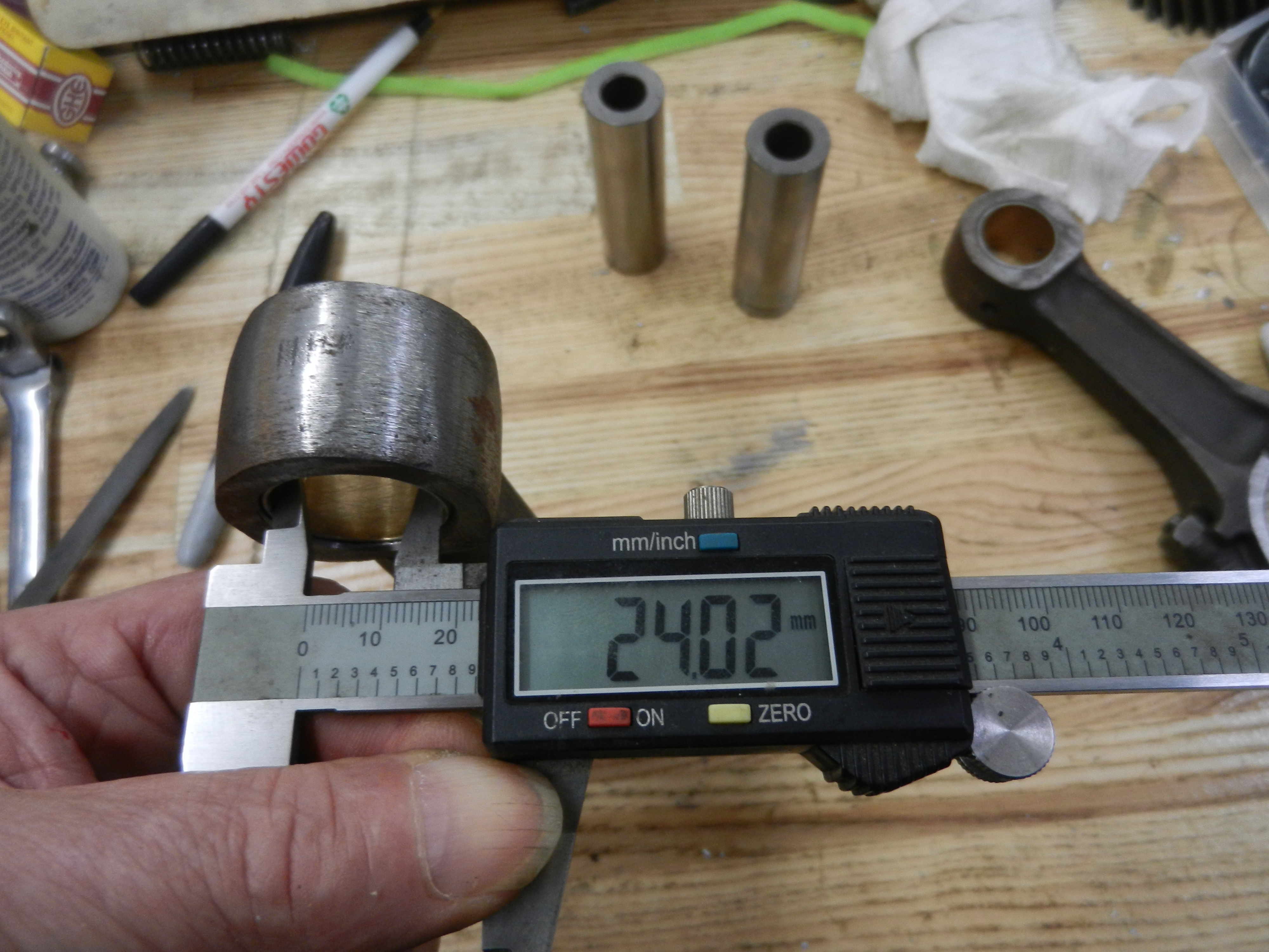 First, I double check the piston pin fit. It slides in nice and tight. These photos show measurements on stock rods. AA rods were the same. Polish the pin. Normally you would use micrometer for these measurements but digital caliper works for visual.