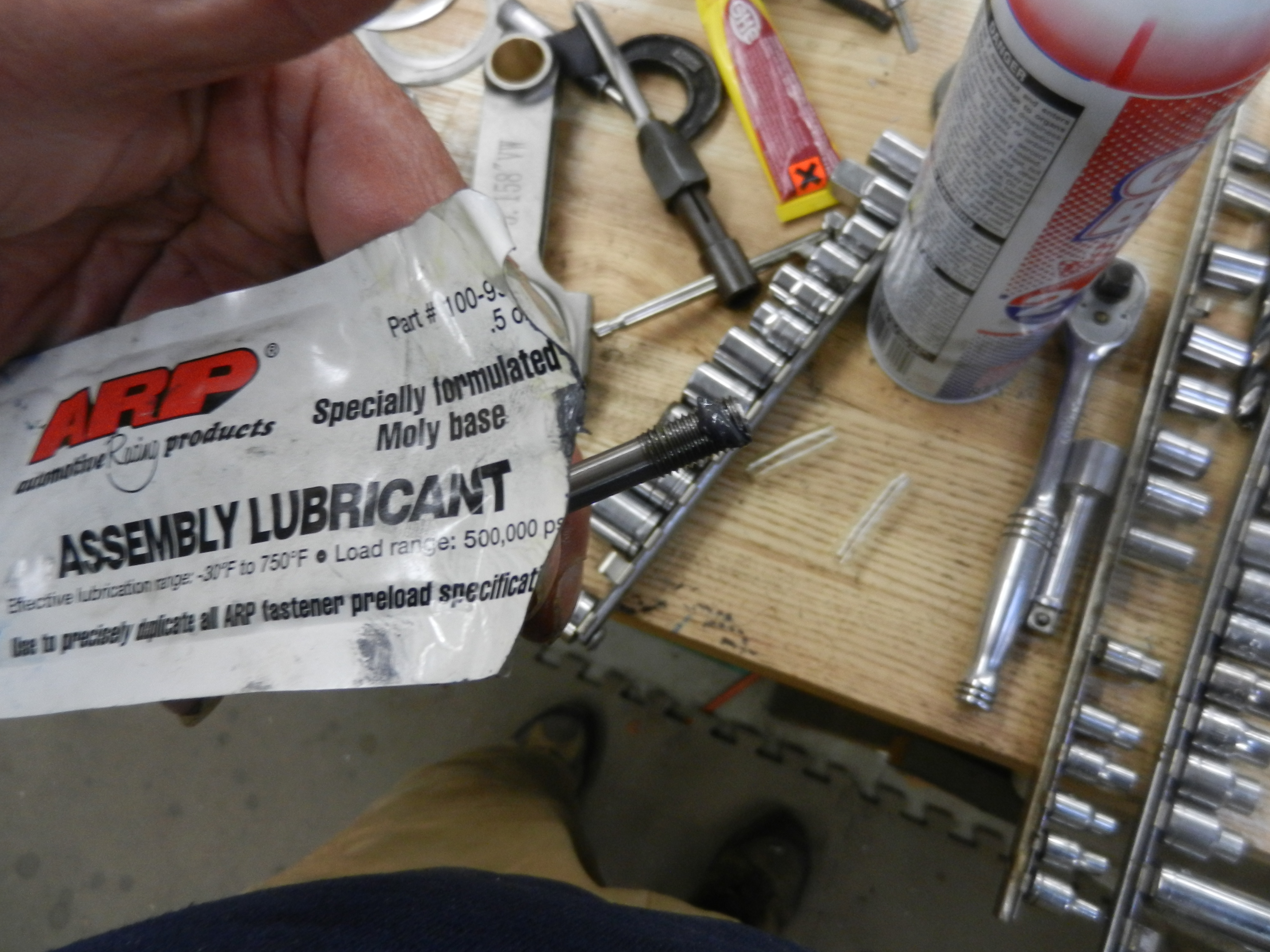 Then lube them up. I have used Spectro assembly lube for years. Squirt some oil into the rod journal and wipe a little white grease on the sides of the rod journal.This helps cushion the side of the rod and get a little oil to the bearing until we get oil pressure when we first crank the motor The AA rods use an arp bolt as opposed to the stock rod cap nut. They require a little grease on the threads. short break, need to take the dog out