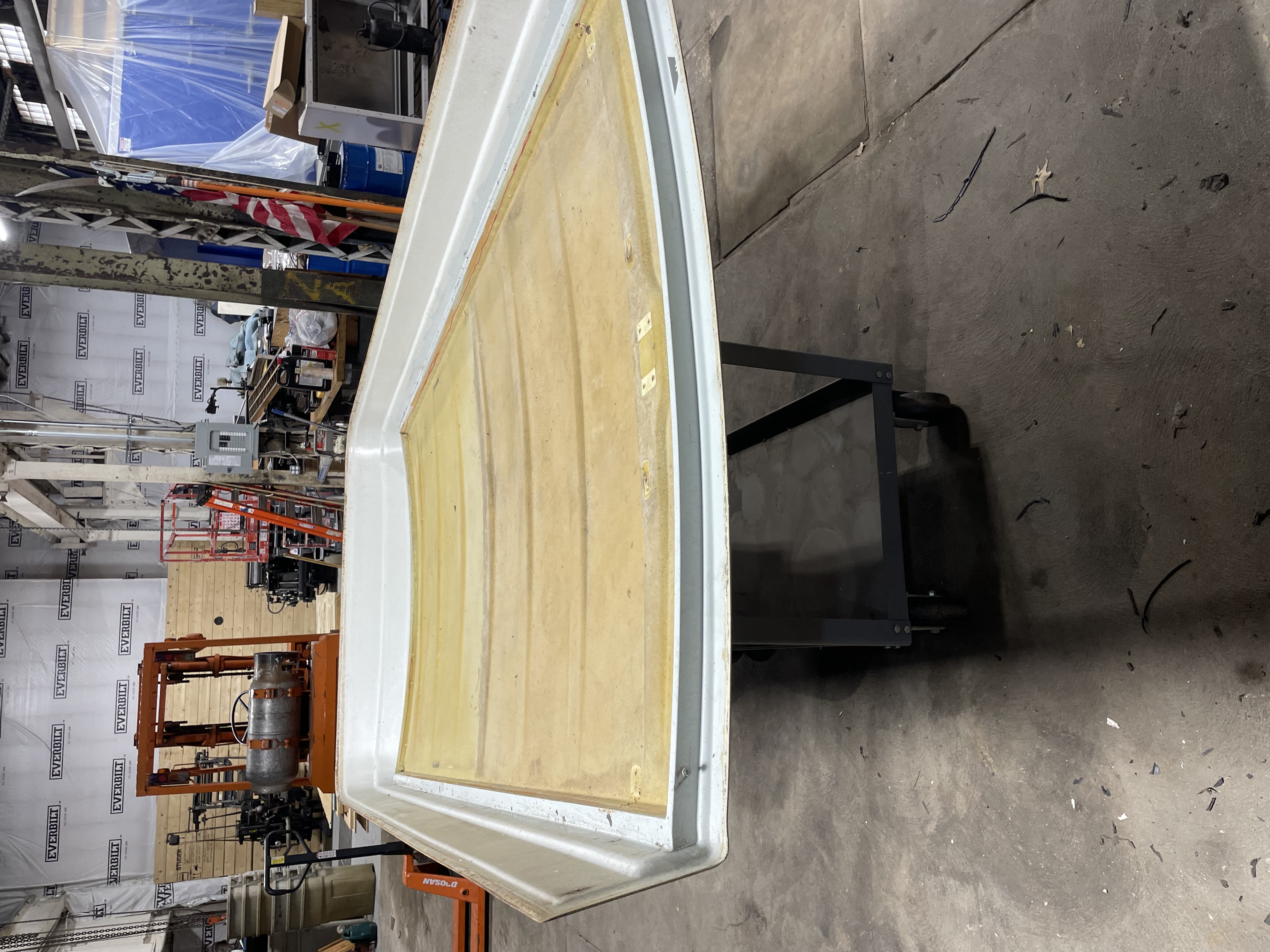 Not unlike a boat. The fiberglass pop top has a gel coat. The top layer of gel coat is dead and beat. A few round of sanding up to 220 grit to get down a nice clean layer of gel coat. There are a few cracks in the gel coat. I got out a small die grinder and opened the cracks up a bit to allow the fiberglass filler to stick. Finally ready to paint.