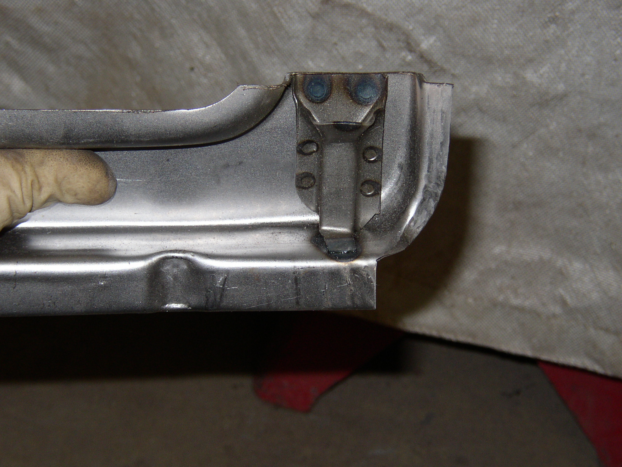 So drill the spot welds partially through to weaken them, then pop them apart with a screwdriver. Here's the bottom, compare it with the rotted OEG- not that much different. Open up the hole with a square file to bring the lock rod about 3/8" outboard. Test fit it. Clamp the guide back in using a hex nut as a spacer. Weld it in place, Drill some holes for plug welds, someday I'll buy a spot welder instead of borrowing Chuck's. It's not going to see daylight inside for a long time so shoot it with some weld-through primer.