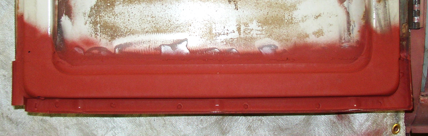 OK, on to the right door. Make your pencil mark where you're going to cut the bottom off. It doesn't have to be even, or level, or in line with the left door. Leave as much OEG metal as you can, mark it just above the rot where there's good metal.