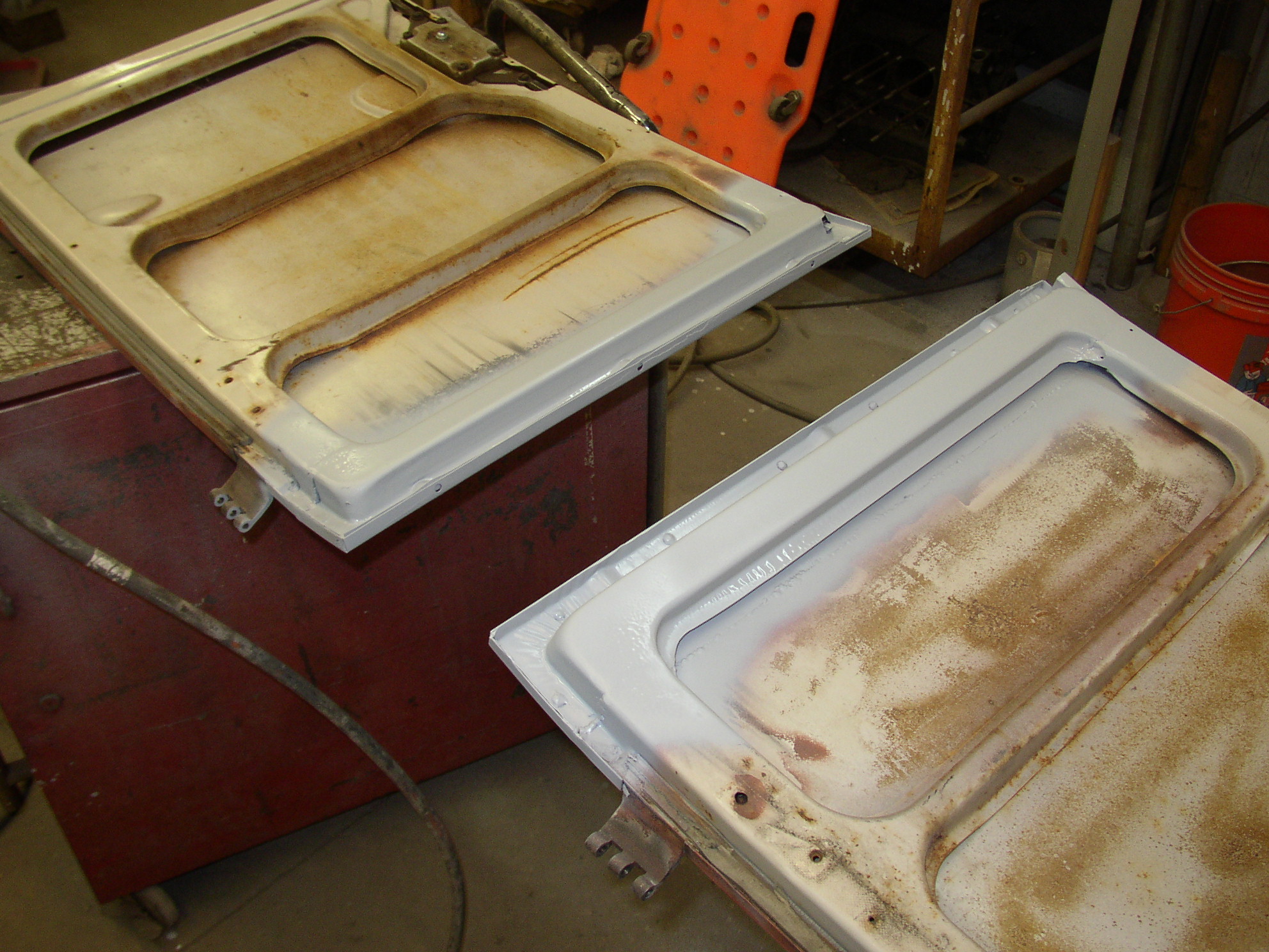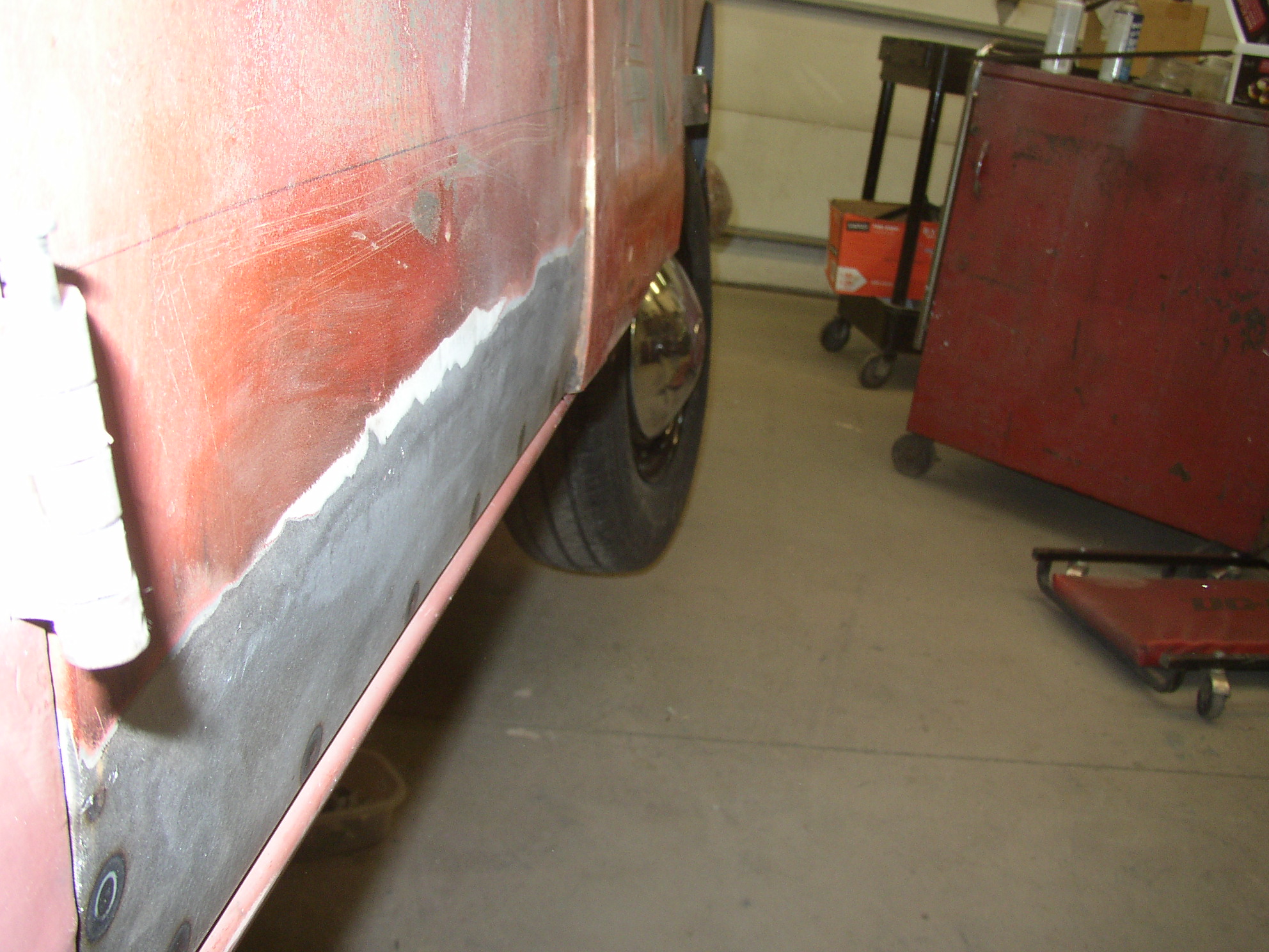 I figured it would be easier off the bus so I popped the pins and worked on a cart. More mud, then 36 grit on an air file.