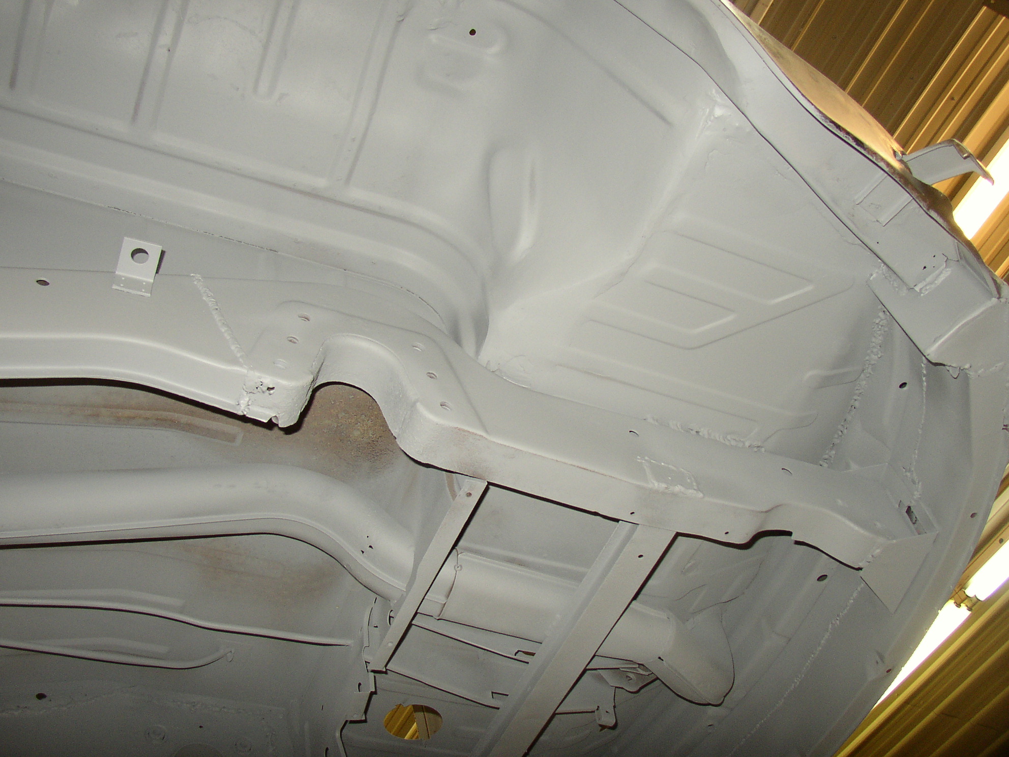 After sealing up the floors and bulkheads with FG, I mixed up some two part primer and shot the bottom. I'll continue working underneath doing a quick sandblast of the entire bottom and end up shooting gray acrylic paint on the whole underneath. I figure this is the best time, as once the outer body is done I sure won't want to be painting the bottom of the bus.