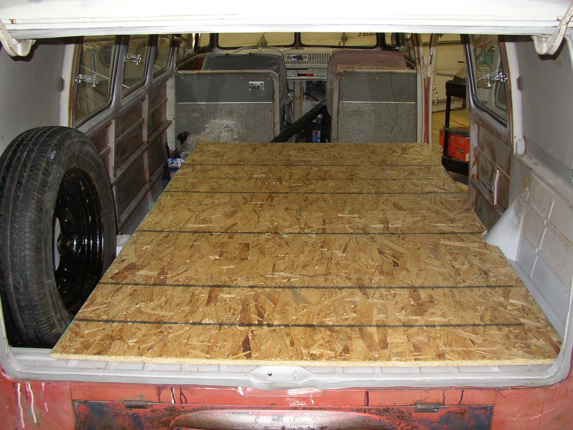 Thinking I'll be sleeping in this bus on campouts I figured I'd set up some kind of hillbilly bed, this consists of a sheet of 5/8" OSB cut to 6.5' long and a support structure. The support is pretty simple- two pieces of 3/8" OSB, each with a slot in them, slid together to form a strong "X". It's very sturdy, even with my fat ass on it. I'll look for some kind of mattress for cushion. Most air mattresses will be too tall which would make me bang my head if I sat up while half-asleep.