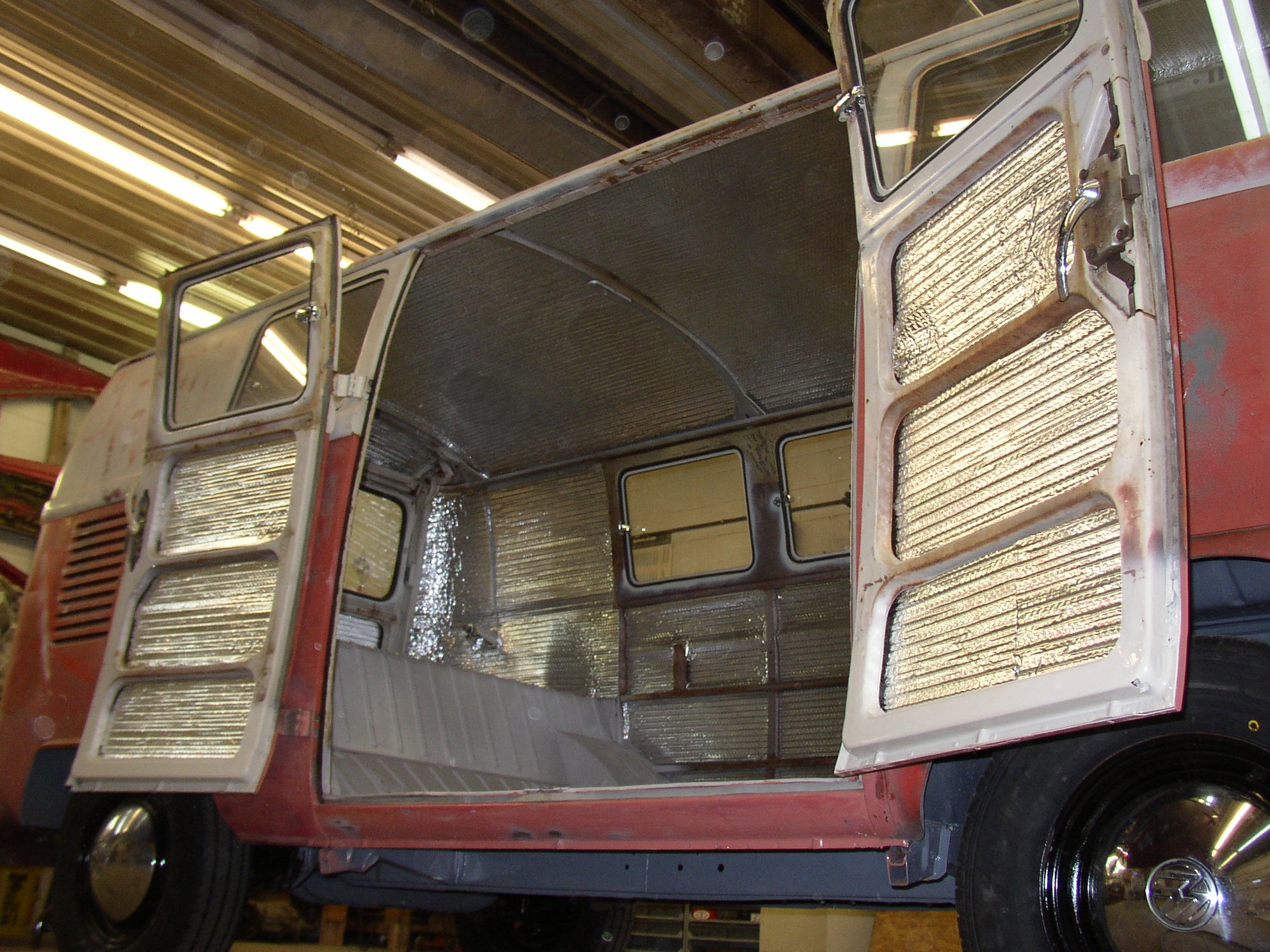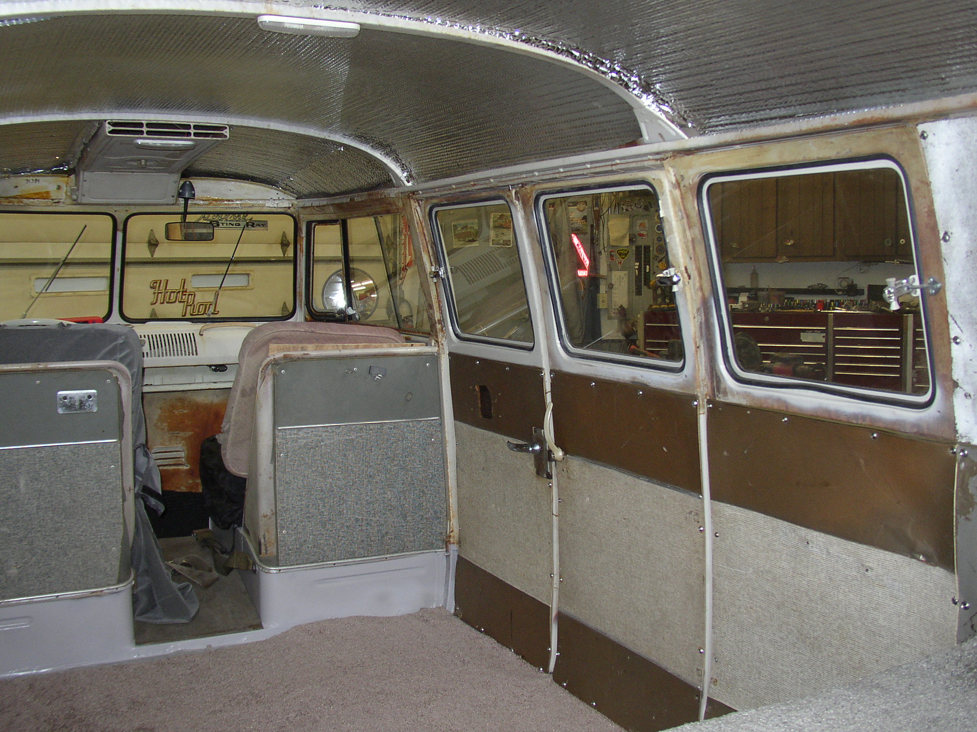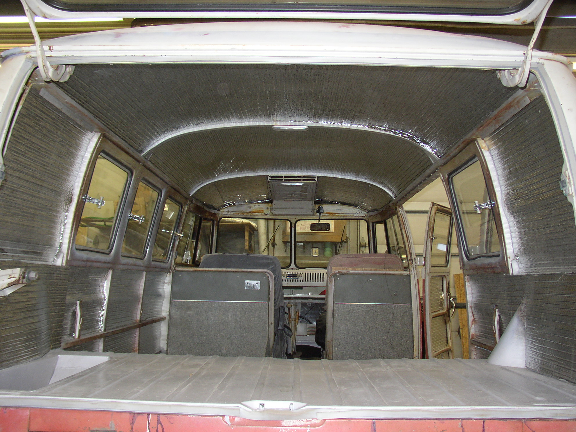 Next is doing something with the interior surfaces. First is taking a D/A with 80 grit and going over the whole inside to remove old glue. (see above pic) Then I used spray glue and Nasa bubblewrap insulation from Home Depot on all inside flat surfaces to reduce noise and hold the heat in. I like the spray glue with the "figure 8" pattern over the regular fan spray. This will also reduce/eliminate condensation from your breath on the roof which will form in cold weather. The problem is now it reflects EVERYTHING and makes you feel like you're in the chicken rotisserie at CFM when you're inside. But it's quiet.