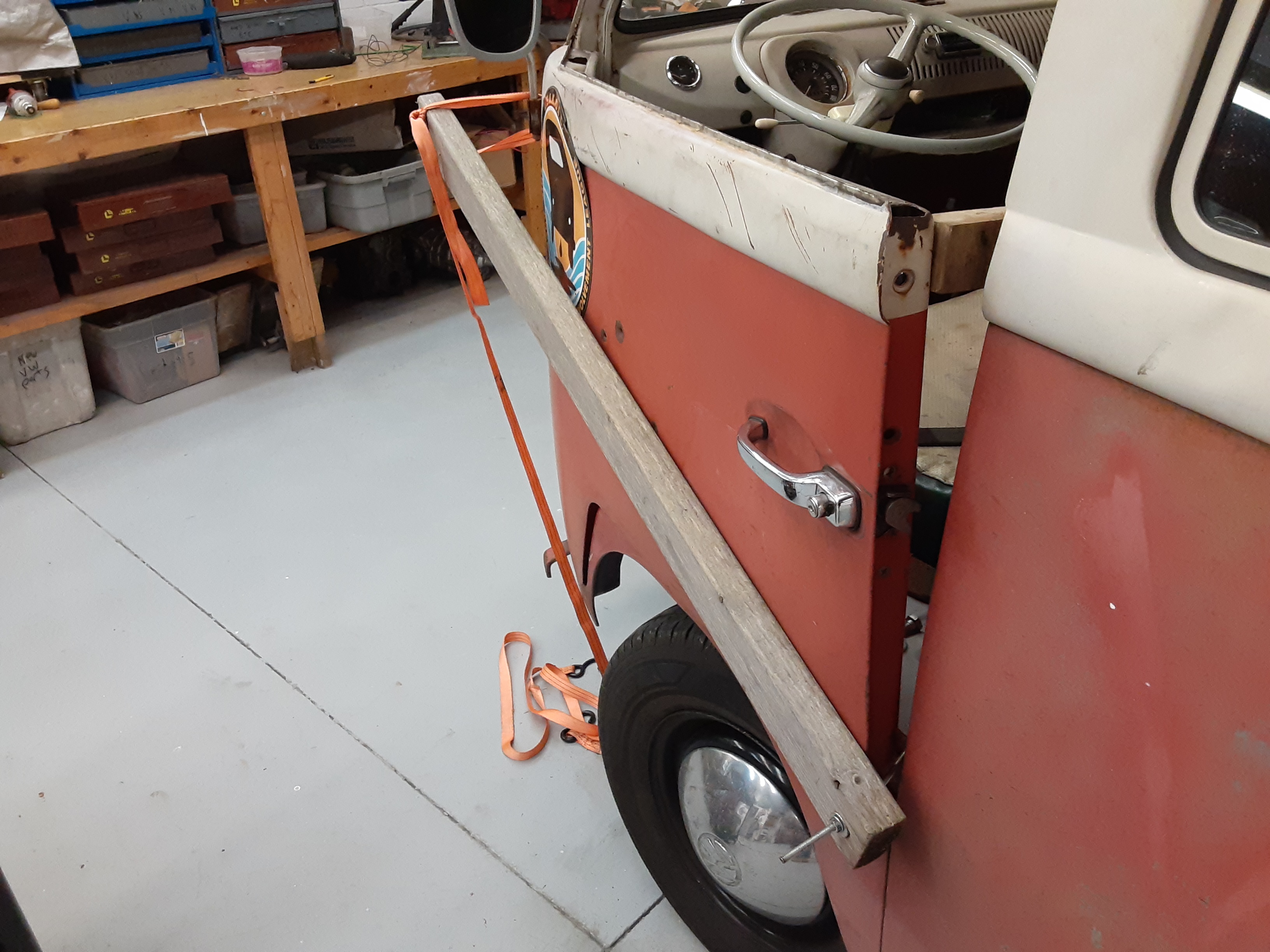 It had a big twist to it. This is closed- the top is inward about 1/4" and the bottom is outside where it should be by at least 1/2". I'm thinking 5/8"-3/4" twist, at least. Wicked air leaks and wind noise, of course. And the center is bowed out 3/8" Even though the front hinge area is kicked in over 1/4". Man, this is one messed up door. I knew this all along but didn't want to take the time when originally building the bus. I knew it would be a large investment of time to make this right. Strip the door and window frame and set up a hillbilly jig to straighten the twist out. It took some serious grunt! Muscle and prybars would not touch it without extra effort. The threaded rod is anchored to a nut bolted to the seat belt mount. Glow the hinges several times to get the angle right. Pull the door and flatten it with a giant c-clamp to get the bow out. I flattened it by over 1/2" here. Heated the window frame to make it fit also, and replaced the weatherstrips for the slider. Put some brake lines in the strips while the glue dried to make sure they dried straight. When done, it fits and closes perfect. No air leaks or wind noise. The gap at the bottom seems a bit large which makes me think it's not from this bus. If I lower it to make that gap right, the beltline is mismatched considerably. I don't want to tell you how many hours I have into this but it's way more than it looks...…...