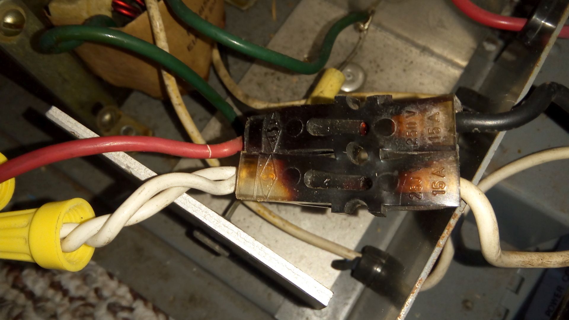 I removed the cover and inspected everything; the outlet turned out to be garbage - with wobbly connections even after tightening down the screws. I then powered the transformer by rigging the black and white input lines to a wall outlet, via an extension cord