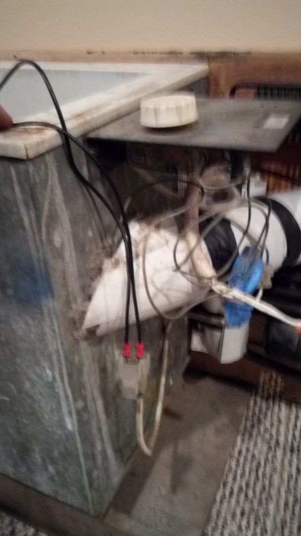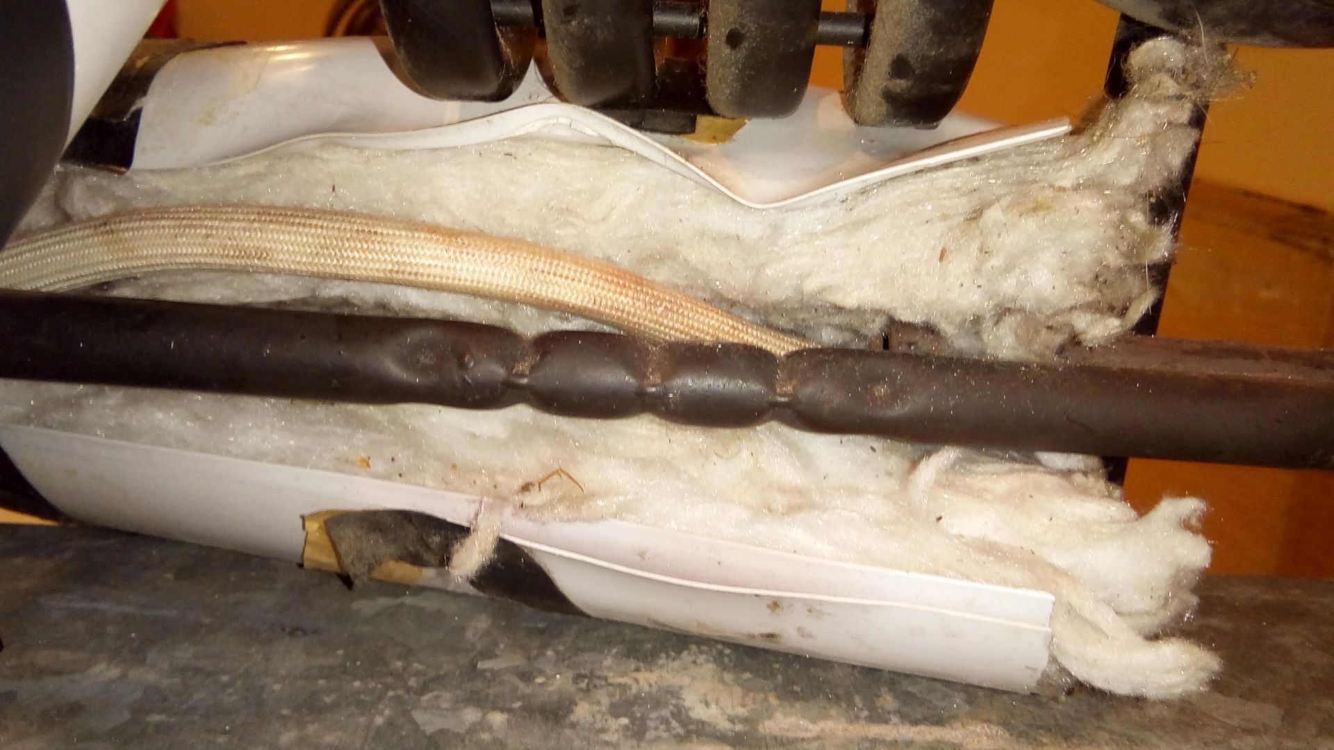 The yellow wire nuts and the electrical tape on the insulation mean that a PO messed with the unit. Removal of the bottom insulation reveals the heating element, hidden inside a tube welded to the coolant line you can see the tip of it inside the tube; admire the ghetto clamping screw! The heating element slides out easily; the first problem is that there are four wires coming out of it, instead of two Notice the stamping for both 12v and 115v, which means that it belonged to a canadian model - with separate circuits for battery and shore power. Next I removed the fabric insulation to expose the entire length of the wires, so I can separate the 12v pair from the 112v pair. I assumed that the 12v pair was the one initially hooked to the blue and black wires on the socket; I actually lucked out on it.Testing is easy - just hook up the wire pair to the battery terminal - I don't think polarity matters the element started immediately, and was piping hot within 20 seconds So the heating element is good!