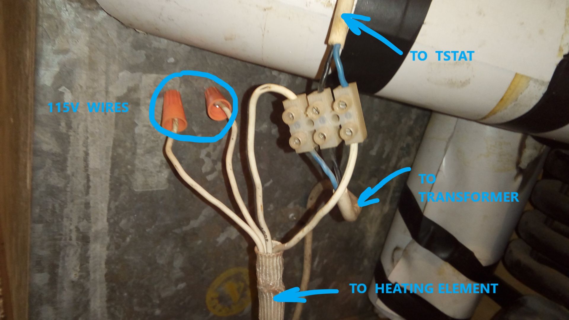 I installed a 20 amp inline fuse and extended the temporary test lines to the fridge. Figuring out the rat's next under the thermostat took a while; I could have hooked up the heating element directly to the transformer and call it a day, but I wanted test the dial knob too. Here is the diagram, the fridge wiring is the rectangle in the middle and here my hookups at the triple connector under the Tstat