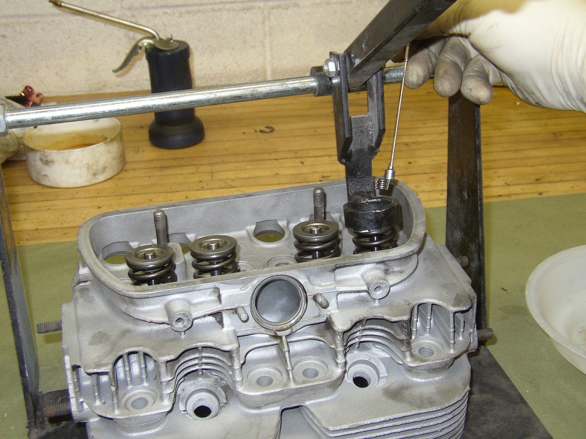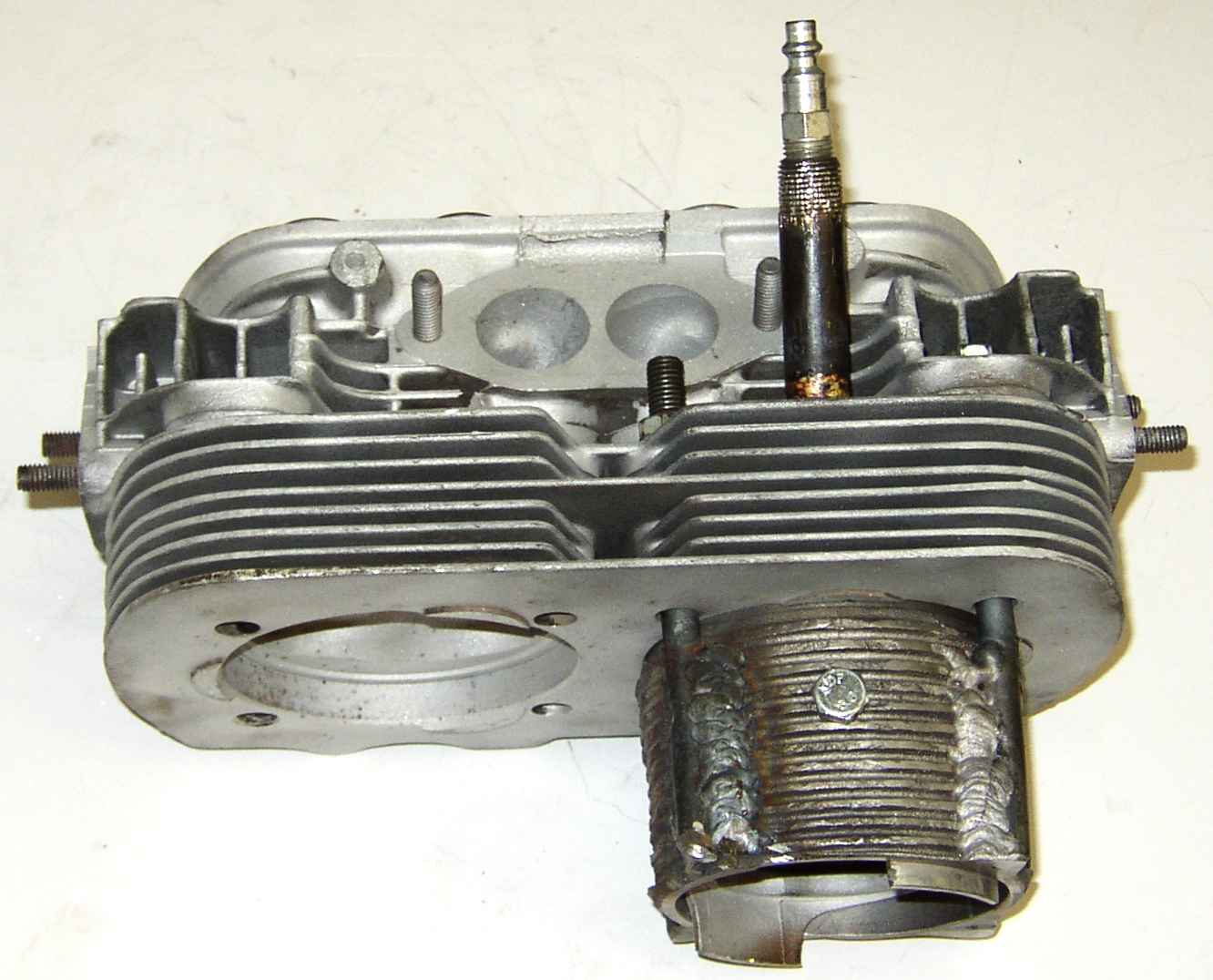 Take an old jug, knock the fins off of it with an air hammer, weld some head studs to it, bolt a piston in with a ring, seal it with RTV, and voila! I have a hillbilly test jig to make sure the valves seat. The welds aren't as bad as they look, and if you can't weld good, weld a lot.