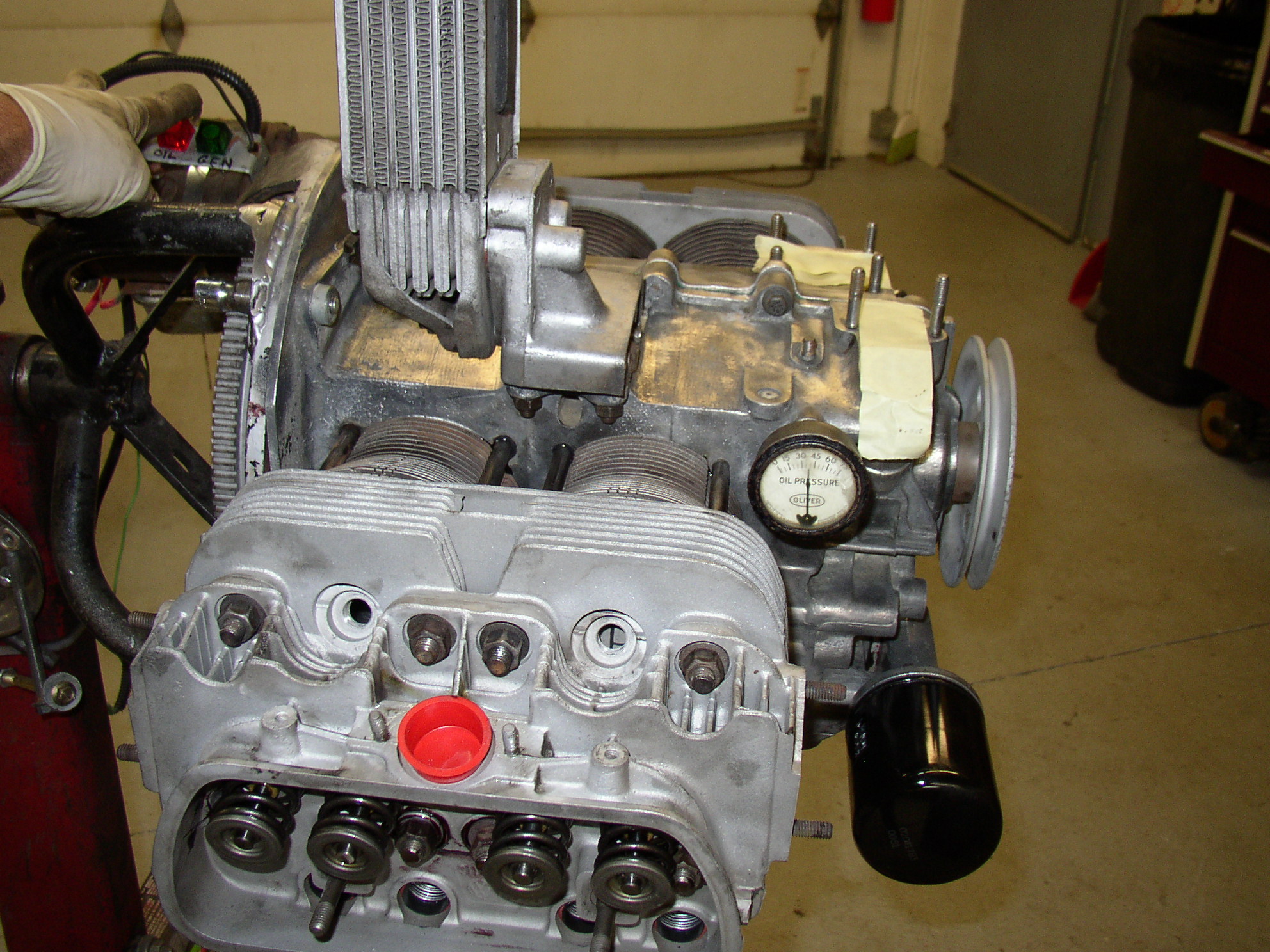 Here's the short block done, it spins freely with zero effort. I've been drilling an extra drain hole in the case to relieve pressure on the rear seal, the hole should be at 6 o'clock and the Germans put it at 8 o'clock for some reason. This leaves an ounce of oil against the lip of the seal when the car is parked and sometimes ends up on the driveway. The heads had less than 1000 miles since last ground, I disassembled them..... And blasted everything. I don't like the "valve grinding compounds" sold lately for lapping as they're too coarse and make little grooves in the valve face and seat, it's like sand in a paste carrier. I tried using rubbing compound this time and it worked great. (you can see a bit of it in the tub in the left background) I used a power drill running really slow and reversed directions a lot, maybe 2-3 seconds at a time and refreshed the compound. Parts done and ready to assemble, German jugs ball honed and checked, no wear or out-of-round measurable. Pistons soda blasted and re-ringed. Heads assembled and ready to go. I always air check heads as soon as they go on to make sure everything is air tight. The compound must have worked well as there was not a bit of leakage. Long block done. Oil system complete and priming, I was able to get 40psi cranking. Note the spark plugs and rocker shafts are off to relieve pressure, the engine spins very free like this to build oil pressure. You can see the "4" written on top of the piston and the notches in each jug to match- 4 notches on #4 jug, 3 on 3. I only use engine oil as an assembly lube, no fancy greases or assembly lubes. Runs perfect and great oil pressure, I use a really thin oil initially on the stand (like 0w-20) while the rings seat in for a few hours and then change to 0w-40 Mobil 1. I'm not finishing the sheet metal trim on this engine because I don't know what it's going into, that's why there's VGs on the heat riser pipes.