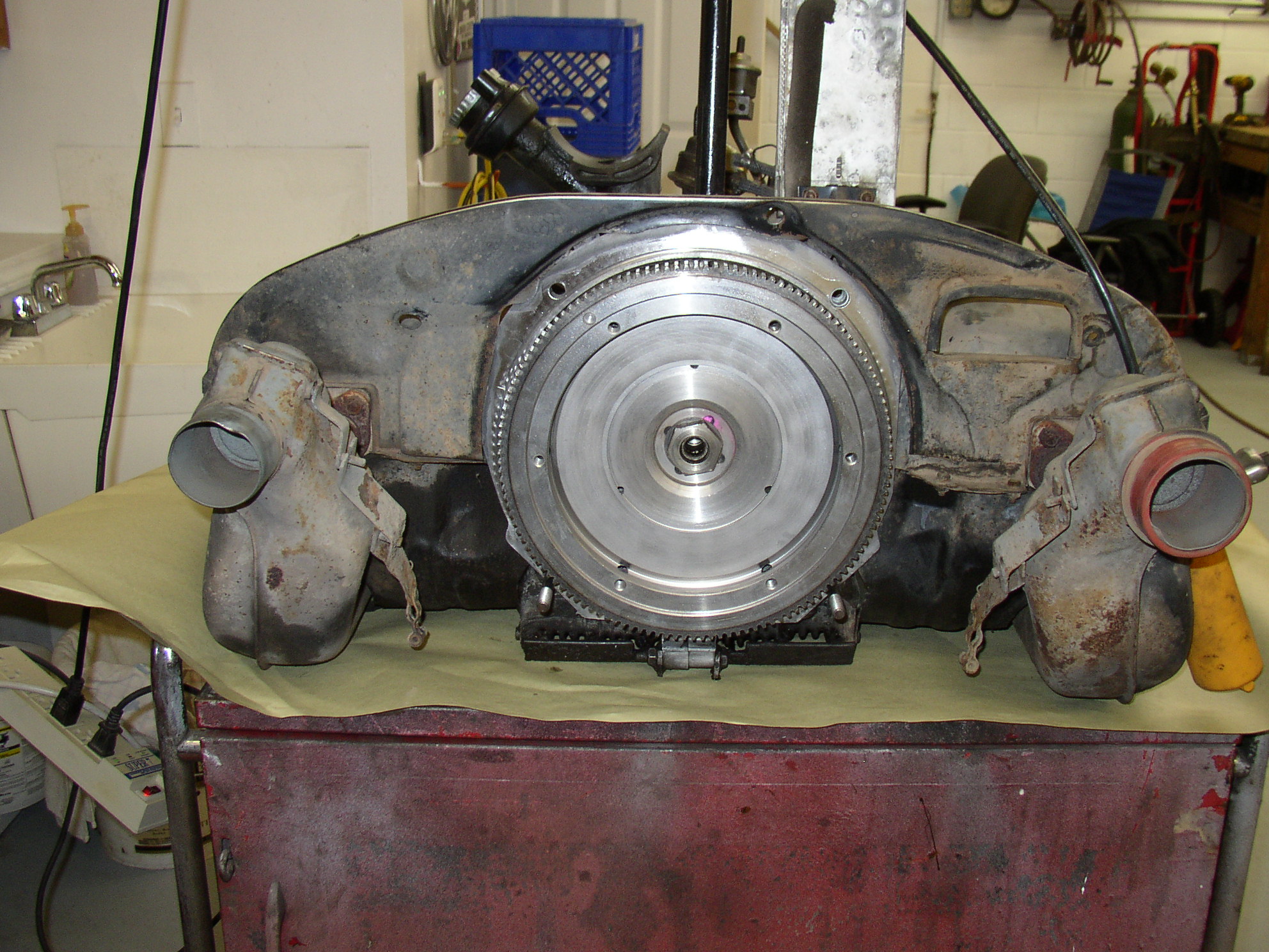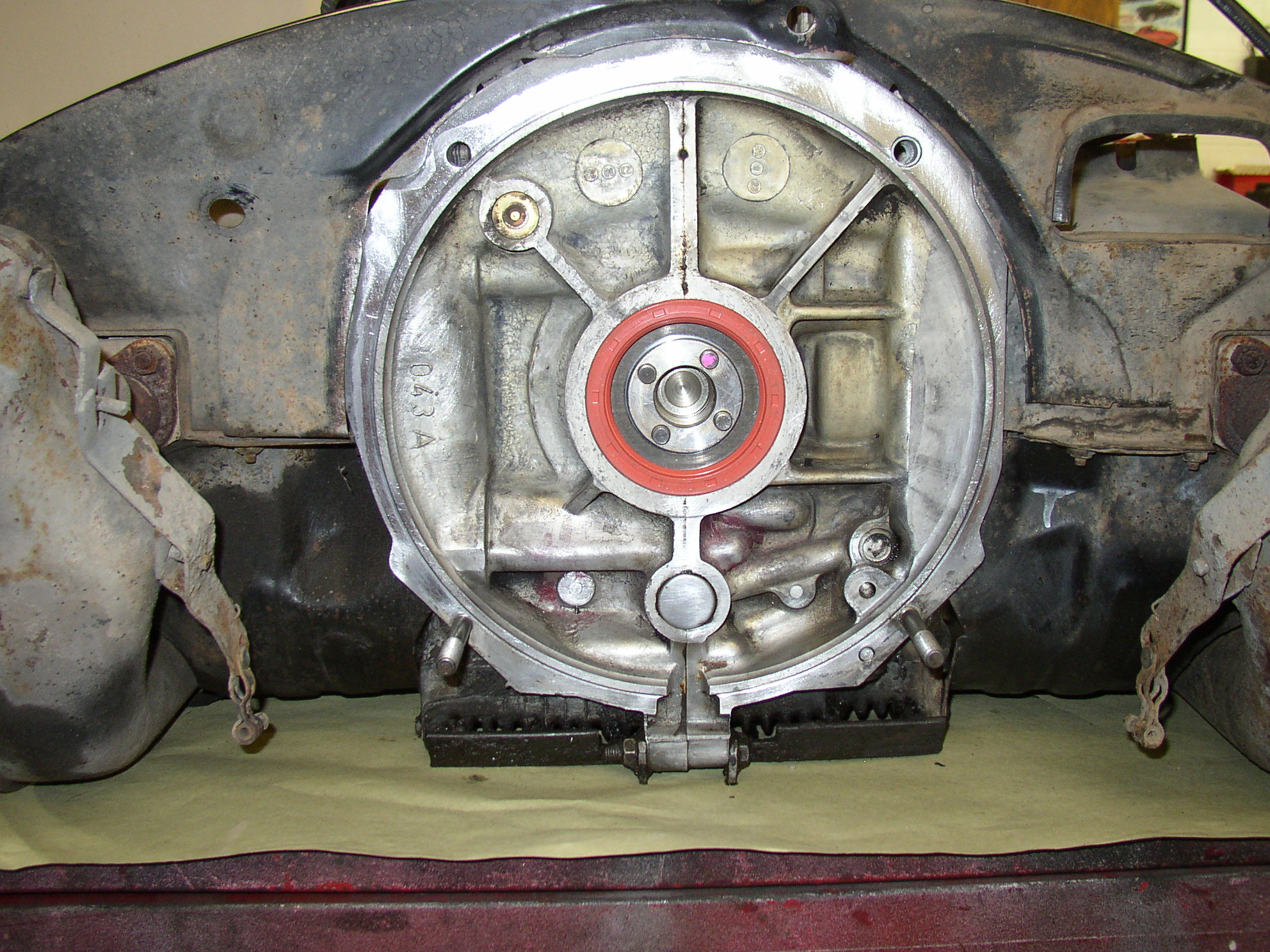 Step 1, yank the engine and strip the top of it to get to the intake boots. The boots look like shit and are dry rotted to the point of being porous. OEG boots commonly look different and many times feel like brand new when removed. Might as well look at the clutch and stuff to find the disc wearing unevenly and the rear seal leaking. I cleaned up the back of the case and put in a new seal. I also bead blasted the flywheel to give the new clutch a nice surface to wear into.