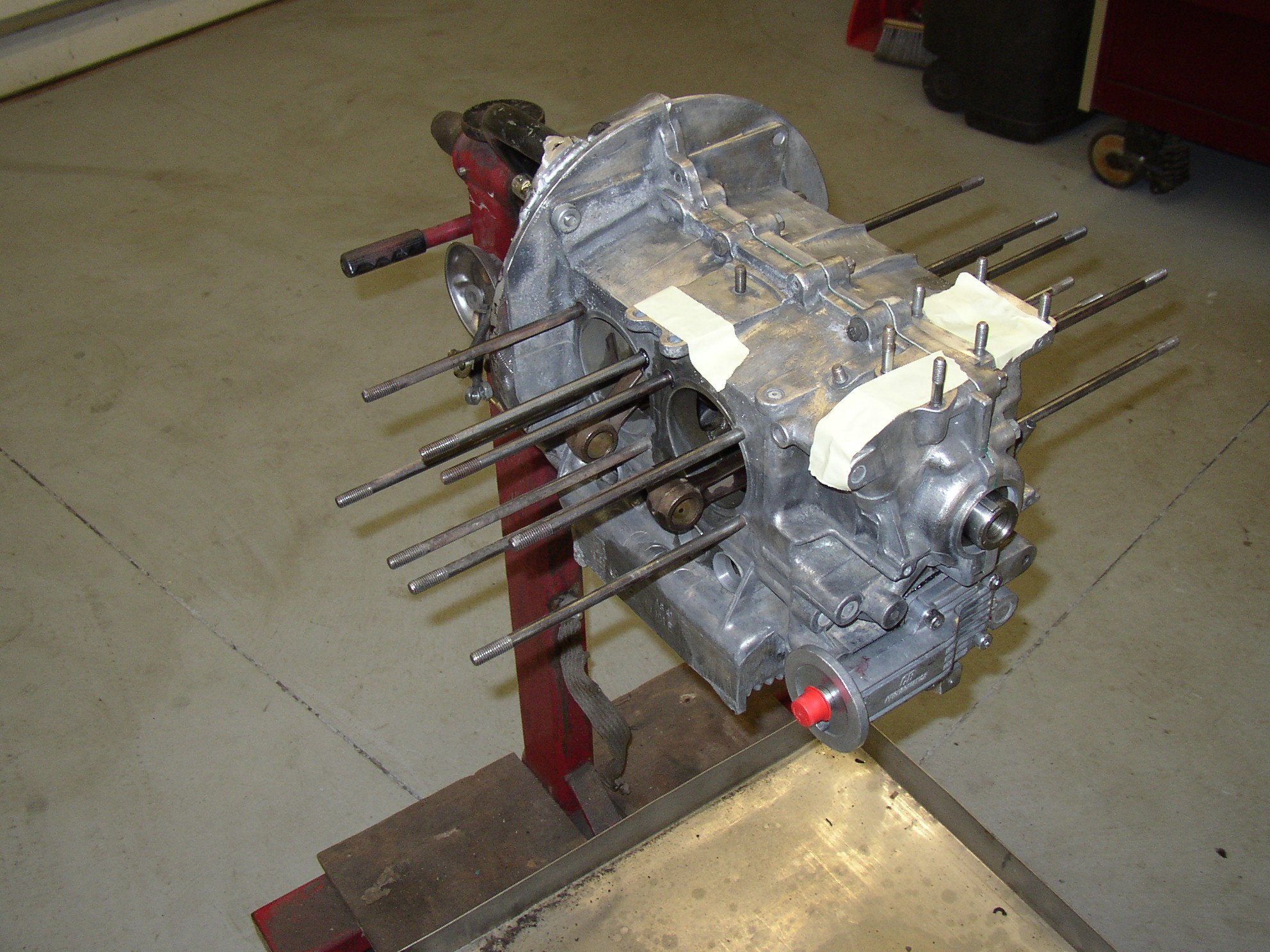 Here's the short block done, it spins freely with zero effort. I've been drilling an extra drain hole in the case to relieve pressure on the rear seal, the hole should be at 6 o'clock and the Germans put it at 8 o'clock for some reason. This leaves an ounce of oil against the lip of the seal when the car is parked and sometimes ends up on the driveway. The heads had less than 1000 miles since last ground, I disassembled them..... And blasted everything. I don't like the "valve grinding compounds" sold lately for lapping as they're too coarse and make little grooves in the valve face and seat, it's like sand in a paste carrier. I tried using rubbing compound this time and it worked great. (you can see a bit of it in the tub in the left background) I used a power drill running really slow and reversed directions a lot, maybe 2-3 seconds at a time and refreshed the compound. Parts done and ready to assemble, German jugs ball honed and checked, no wear or out-of-round measurable. Pistons soda blasted and re-ringed. Heads assembled and ready to go. I always air check heads as soon as they go on to make sure everything is air tight. The compound must have worked well as there was not a bit of leakage. Long block done. Oil system complete and priming, I was able to get 40psi cranking. Note the spark plugs and rocker shafts are off to relieve pressure, the engine spins very free like this to build oil pressure. You can see the "4" written on top of the piston and the notches in each jug to match- 4 notches on #4 jug, 3 on 3. I only use engine oil as an assembly lube, no fancy greases or assembly lubes. Runs perfect and great oil pressure, I use a really thin oil initially on the stand (like 0w-20) while the rings seat in for a few hours and then change to 0w-40 Mobil 1. I'm not finishing the sheet metal trim on this engine because I don't know what it's going into, that's why there's VGs on the heat riser pipes.