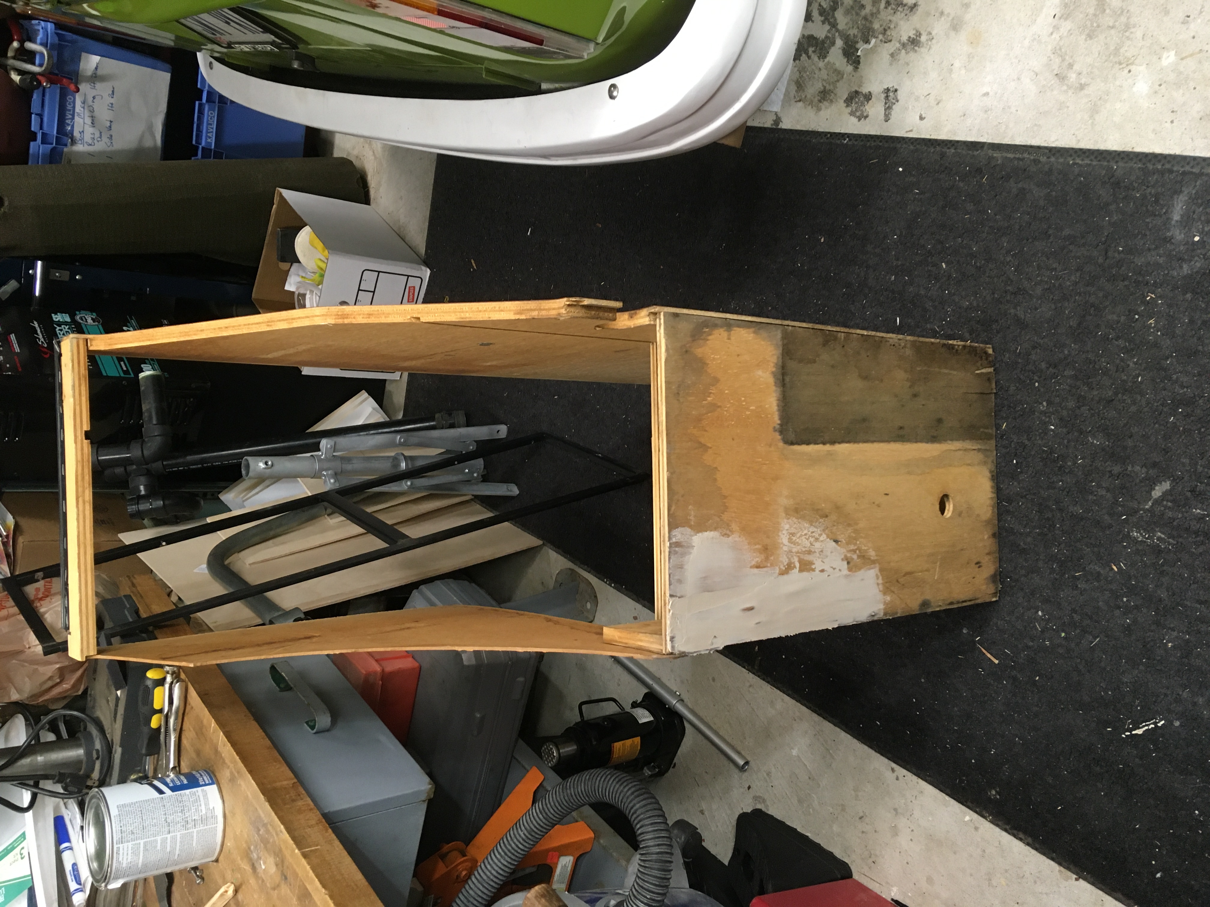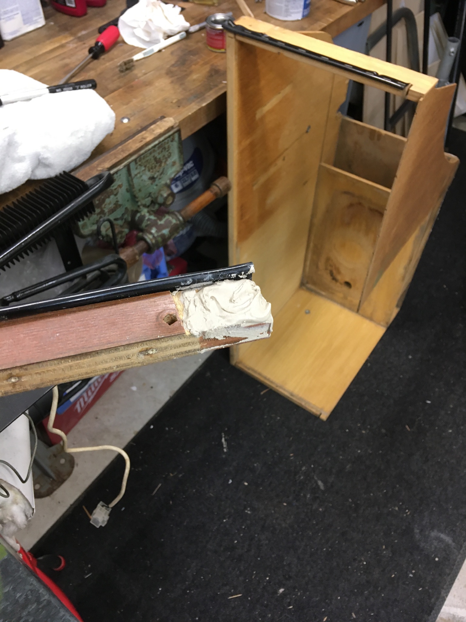Today I worked on the refrigerator cabinet. It had a bit of water damage from the vent window that had been leaking. There was a piece of laminate missing on one end and a layer of the plywood underneath. I mixed some epoxy wood filler to level out the missing plywood layer and the will glue in a new piece of laminate. The bottom of the cabinet had begun to delaminate so I glued that back together and then used some epoxy filler for the gaps. The rail that the refrigerator lid and storage compartment lid attached to had loose holes were the hinge attached. I used some gorilla glue and toothpicks to fill the holes and the drilled new smaller holes My son and I cleaned and polished the galvanized sides of the fridge. Tomorrow I plan to sand and varnish the bottom area under the fridge and back side. The laminate on the front is in pretty good shape.