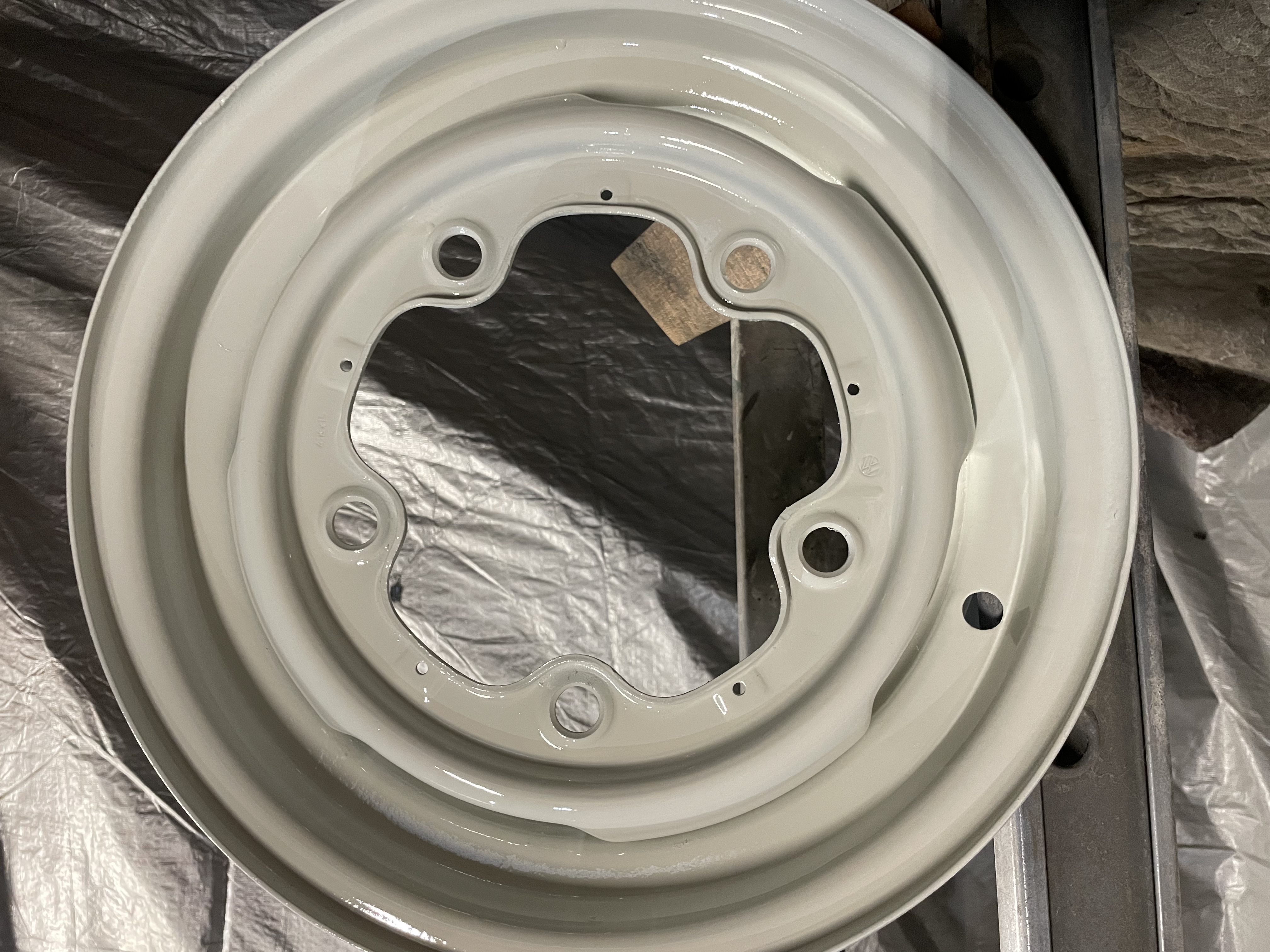 Over the years I have slowly collected stock 15” Bus wheels. 7 of them to be exact. After a little checking, 1 seems to be questionable. So 6 wheels went out to the sandblaster to be cleaned up and double checked for any issues before painting. I called up Sherwin-Williams Automotive paints and they can mix up many of the old VW colors including L82 Silver White for bus wheels and bumpers. So I ordered L82 in a single stage paint and separate hardener.