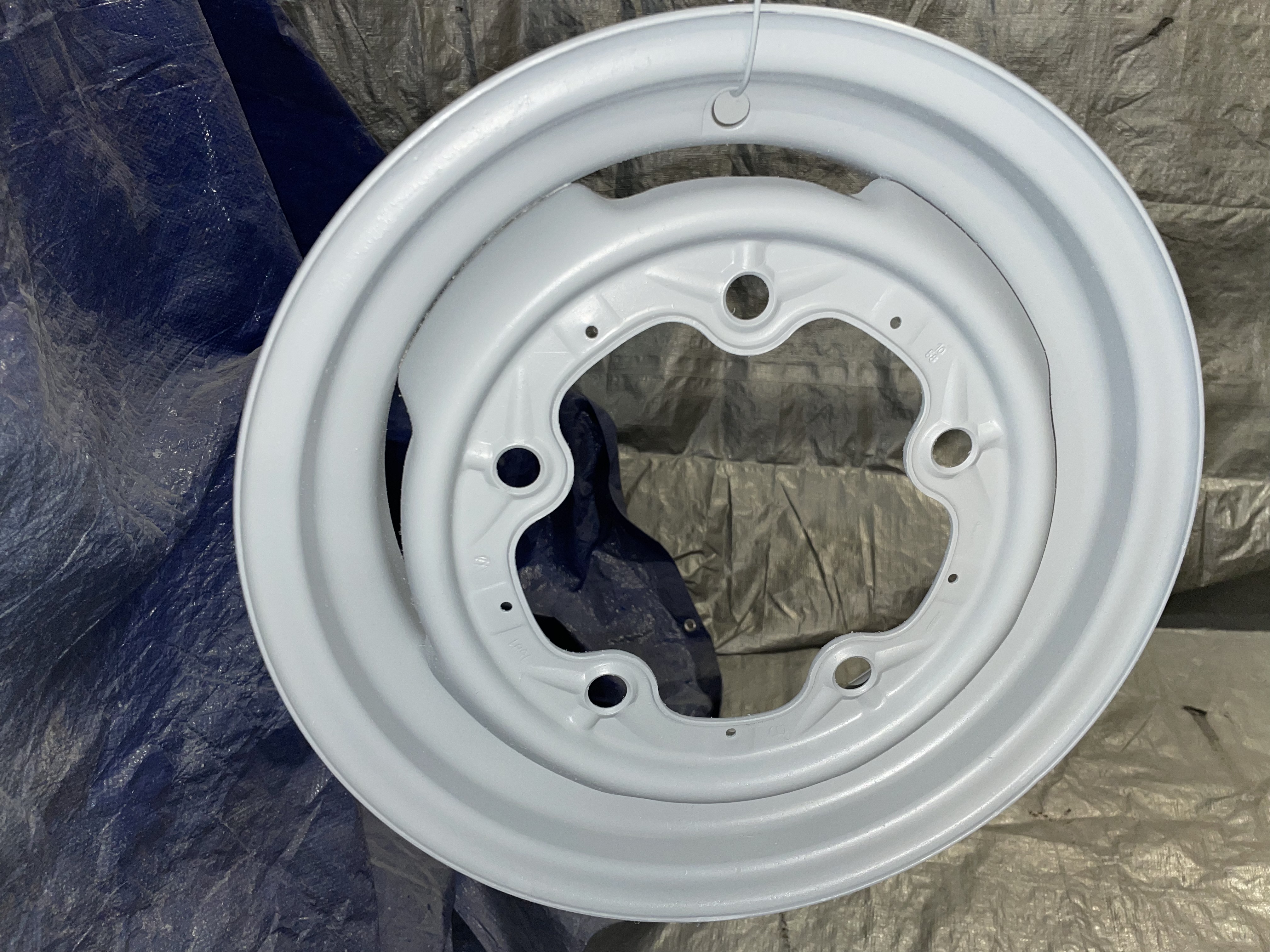 Over the years I have slowly collected stock 15” Bus wheels. 7 of them to be exact. After a little checking, 1 seems to be questionable. So 6 wheels went out to the sandblaster to be cleaned up and double checked for any issues before painting. I called up Sherwin-Williams Automotive paints and they can mix up many of the old VW colors including L82 Silver White for bus wheels and bumpers. So I ordered L82 in a single stage paint and separate hardener.