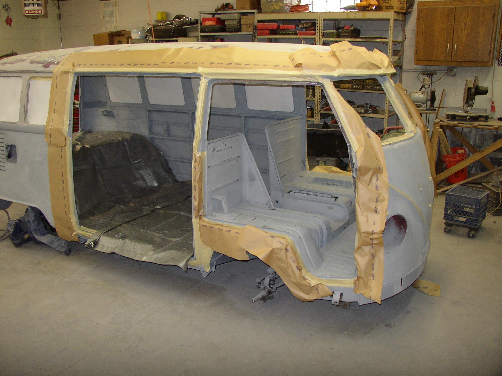 The idea is to shoot the inside of the roof with the 45* gun, then switch to the DeVilbiss gun and shoot the insides. Then pull the tarps and shoot the floor before finally unmasking the dashboard (to protect it from overspray and drips) and shoot it last. I also shot the white parts of the jambs so they will blend easier when shooting the exterior. I also did the funny "eyebrow" area over the windshields where the screens are as this will be tough later on.