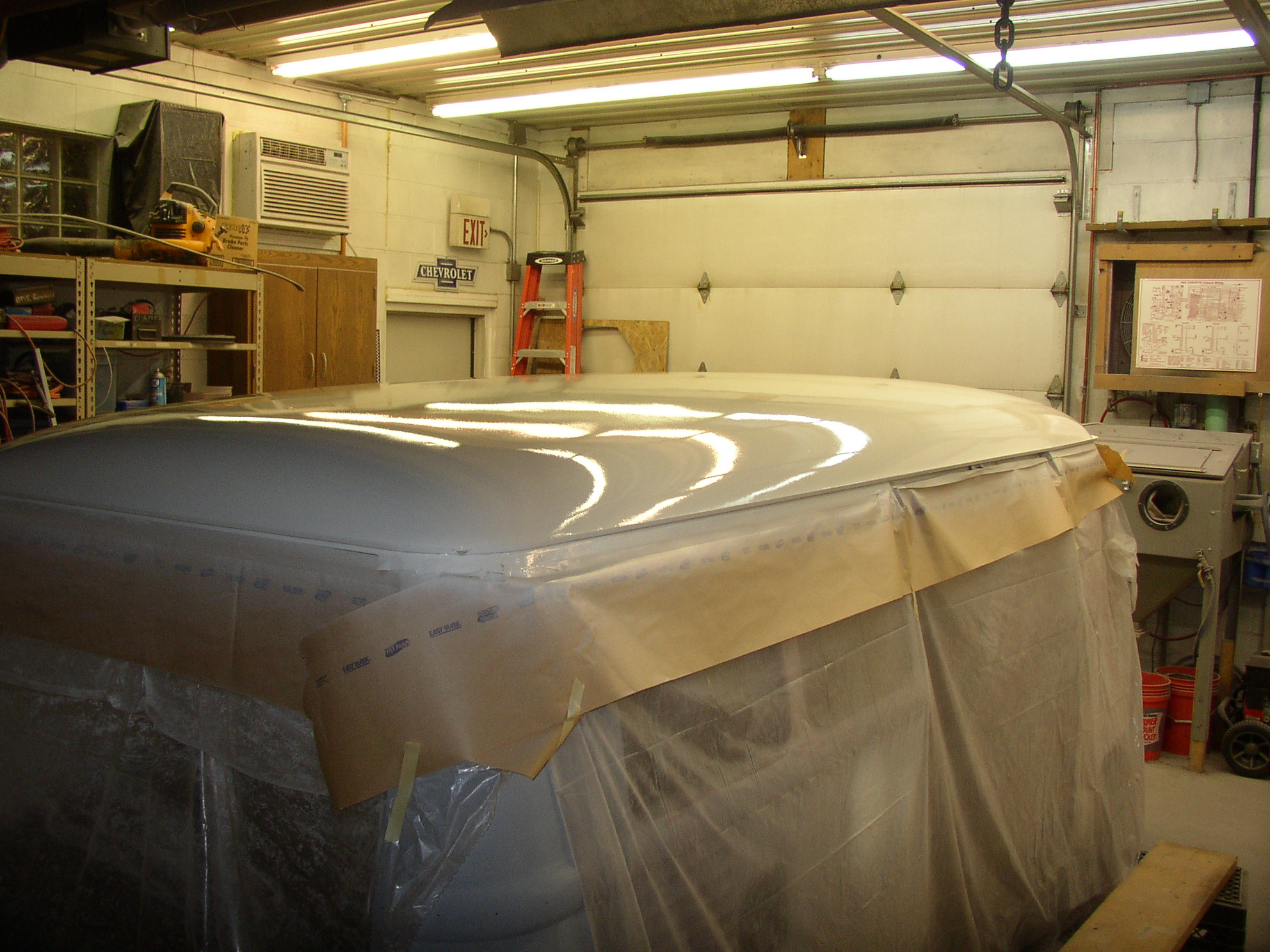Anyway, I primed the roof and air filed it out with 280 and it looks great in primer. It's really straight where I fixed the dents and looks perfect when the primer is wet. I sealed the gutters and it's ready, I'm very confident that when it gets color it should look terrific (if I shoot clean color!).