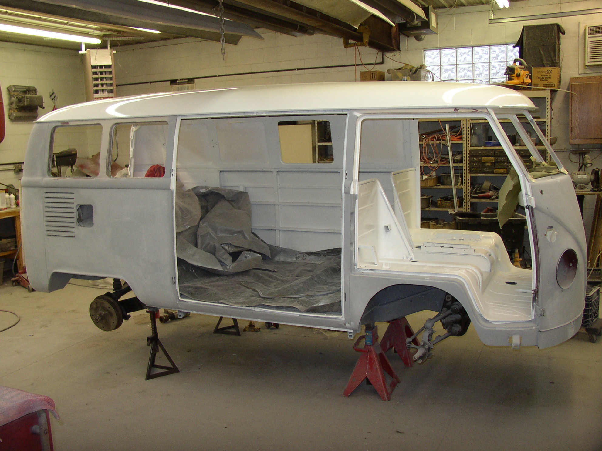 Finally got some time dedicated to the bus and got a lot done but not without a big hitch. Monday I finished prepping the interior with dabs of mud, weld and etc to fix all of those little things that show up in primer. I masked the bus and left the heat on warm all night so I could shoot yesterday on warm metal. I went in early (10 is early for me) looking forward to shooting the PPG DelFleet paint I bought a couple of months ago. I usually use the cheap stuff (Kirker) which I've had good luck with for decades but this time I was talked into the good stuff by a local authority (to be named later). I read the instruction sheet again and mixed the paint using a digital scale to exact gram measurements. The surface temp was 75ish with an IR gun when I started and shit went wrong from there in a big way. I was having no luck at all with this paint- thin, ran, wouldn't cover, wouldn't set up, I meant this shit was bad. It was like shooting milk from a spray gun. I called Chuck with a 'WTF am I doing wrong' tone of voice, he came right out and arrived at the conclusion I got a bad can of paint. Luckily I had 1.5 gallons of white Kirker in the cabinet, so I switched to that and had much better luck. All in all, a good day in the long run.
