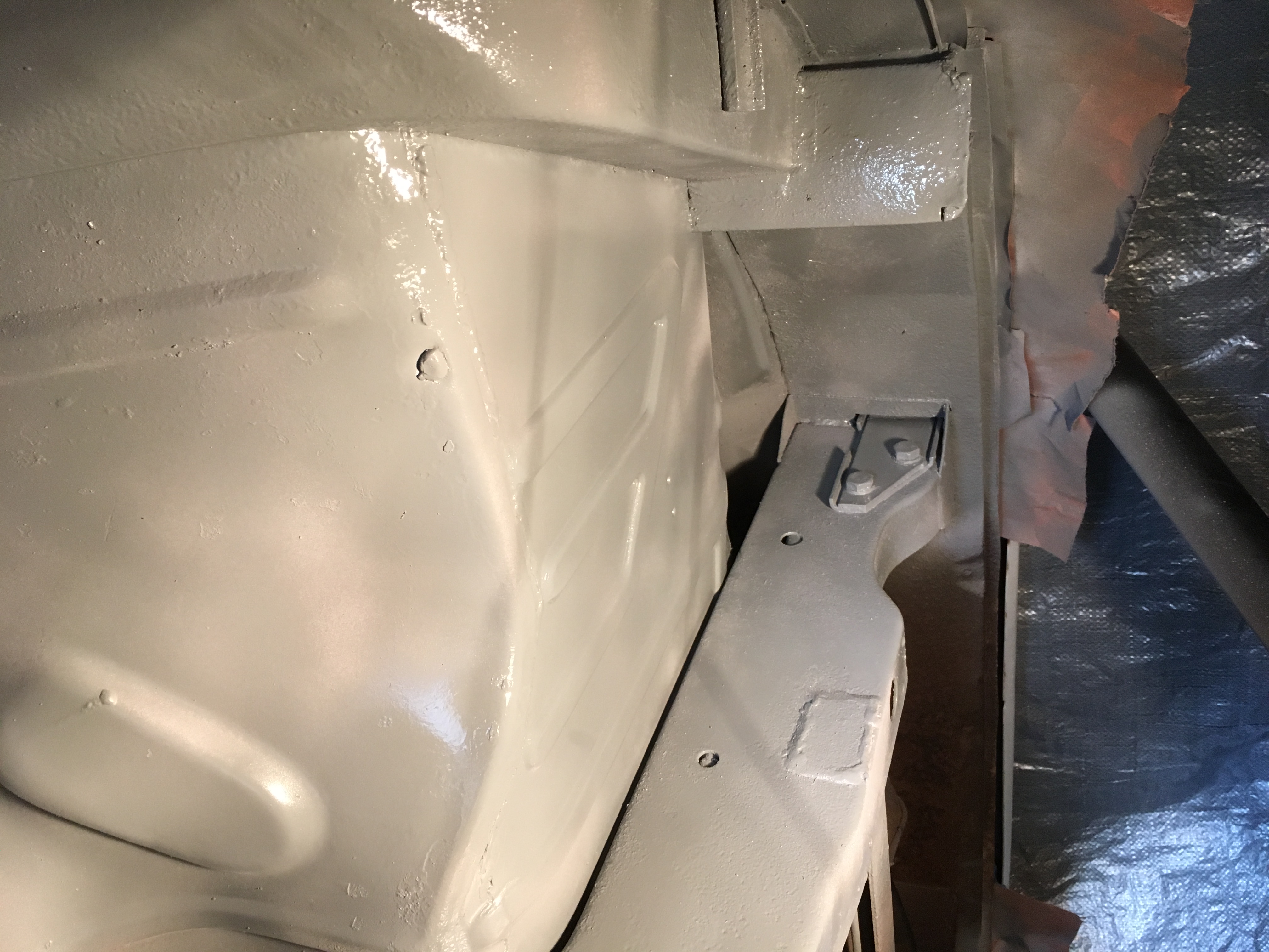I finished getting the wheel wells painted and decided to do under the front nose as well. The underside of the nose was very solid. Some surface rust was about all I saw. I used the same process and just finished putting the final coat on this AM.