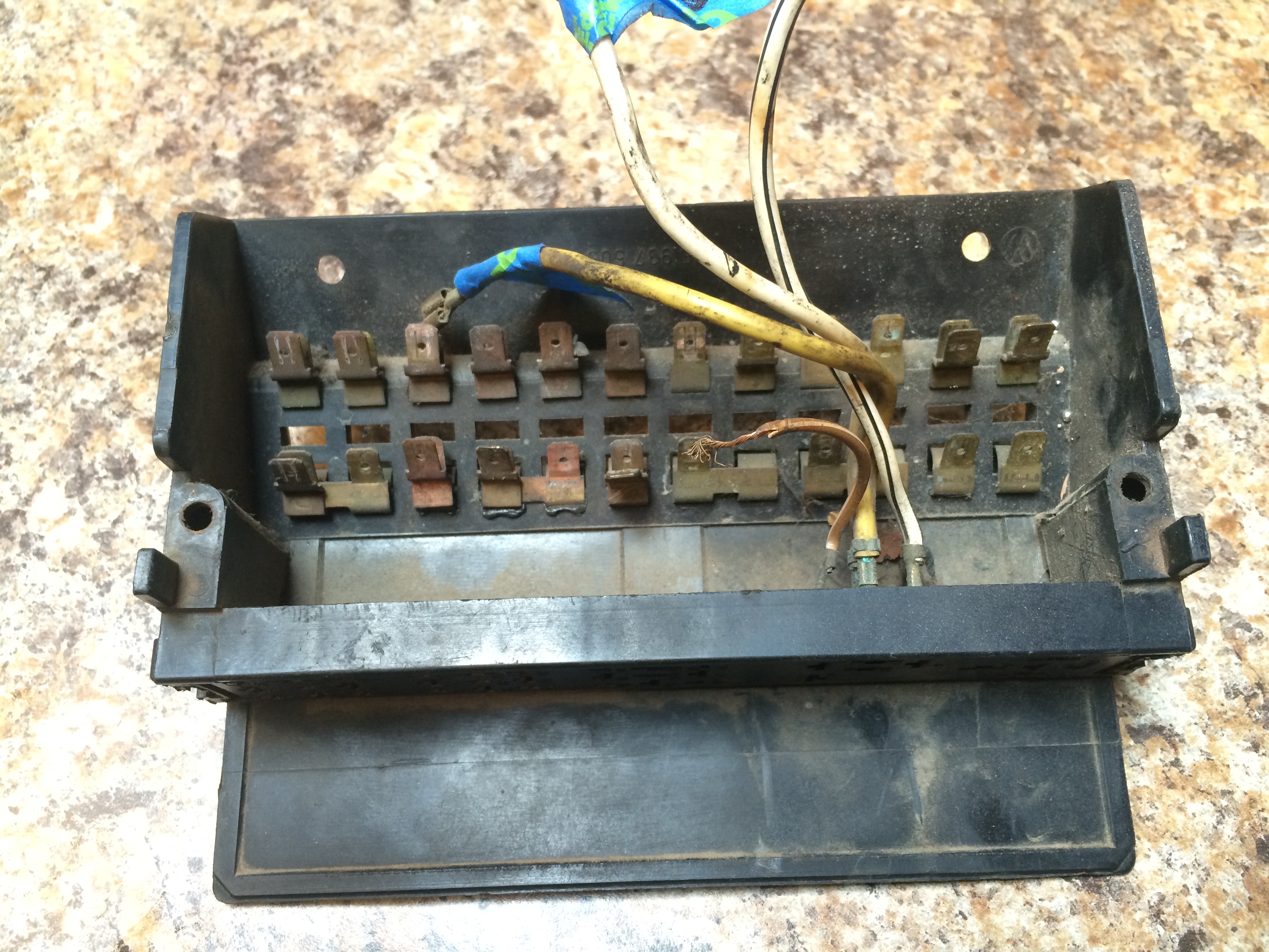 ). It does not appear that any attempt to follow the original VW wiring diagram was made as many switches were wired straight to the incoming twelve volts bypassing the fuse block all together. Everything worked but there was evidence of multiple shorts, melted wires etc... I have rewired buses before but not from scratch, usually most of the wiring was intact and I could simply repair and replace. The horn wire was routed to a push button on the dash, the rear taillights were operated from a separate switch also mounted on the dash, a Toyota turn signal relay was spliced into the wiring for the stock fuse block location and then left dangling below and a lawnmower type ignition switch was used and mounted to the dash. Most of the ground wires were rerouted, the ground mounting point below the windshield wiper was a popular spot with over 9 connections, they just spliced and twisted new connections to each other. One thing I am having a hard time figuring out is whether the ignition switch wiring (all the original wiring was removed) went directly to the fuse block or into a multiport connector first. My guess is that it went straight to the fuse block, though I am not the best with current flow diagrams. The turn signal and windshield wiper wiring were about all that was intact (at least at the switch) and I can see that they connect to a multiport connector.