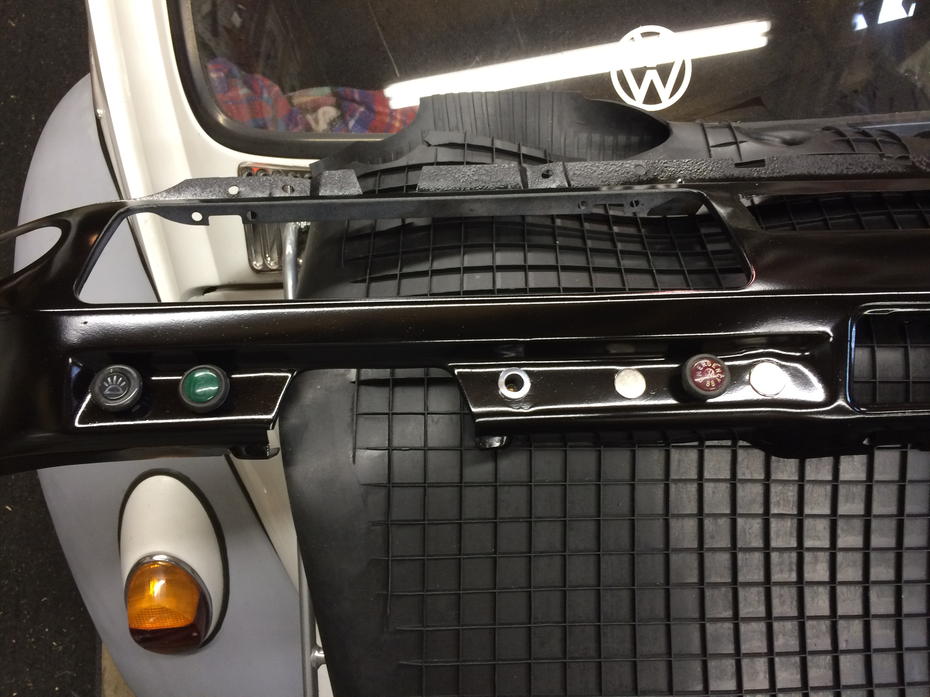 Took a break from the wiring to sort out all the holes in the dash. Being that I cannot weld I needed to figure out a way to make the holes look better. I stripped and primered the dash. Smoothed out the holes with a dremel. Mounted the Headlight Switch and the Emergency Flasher Switch in their stock locations (I think) and then added a power supply port from a Westfalia and a defroster switch I will use for fog lights (ordered a new bezel). Then I used some chrome hole plugs from the hardware store to fill the other holes. Painted the dash satin black. I think it looks pretty good.