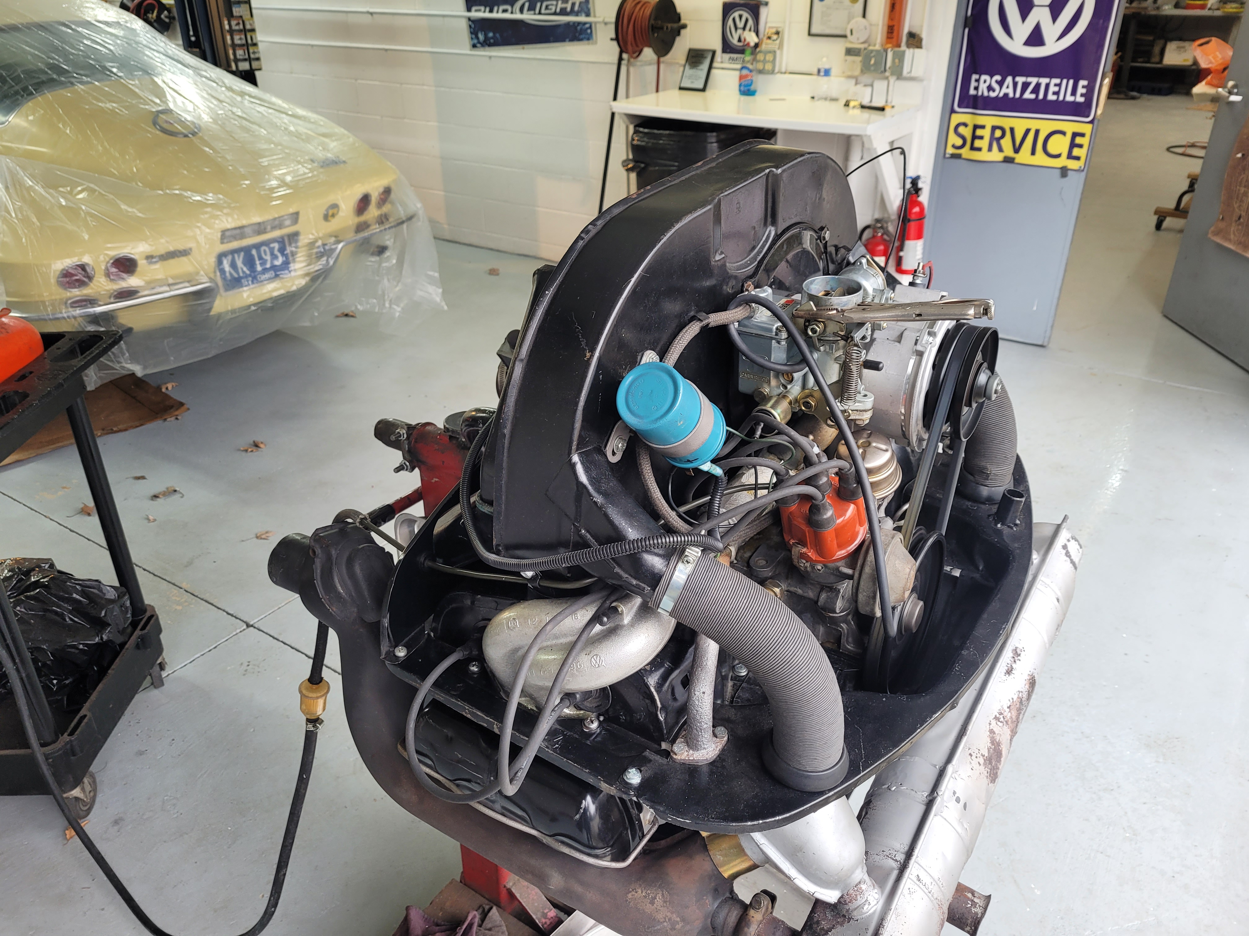 The motor is done, runs perfect, has about 8 hours run time on the run stand, oil changed, valves reset and ready to rock. Note the frost on the intake, that day was about 45 and humid, the perfect weather for carb icing. Tranny was done from Jim's (warranty job