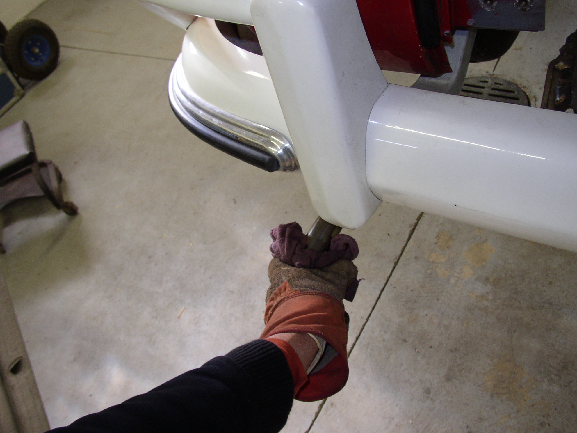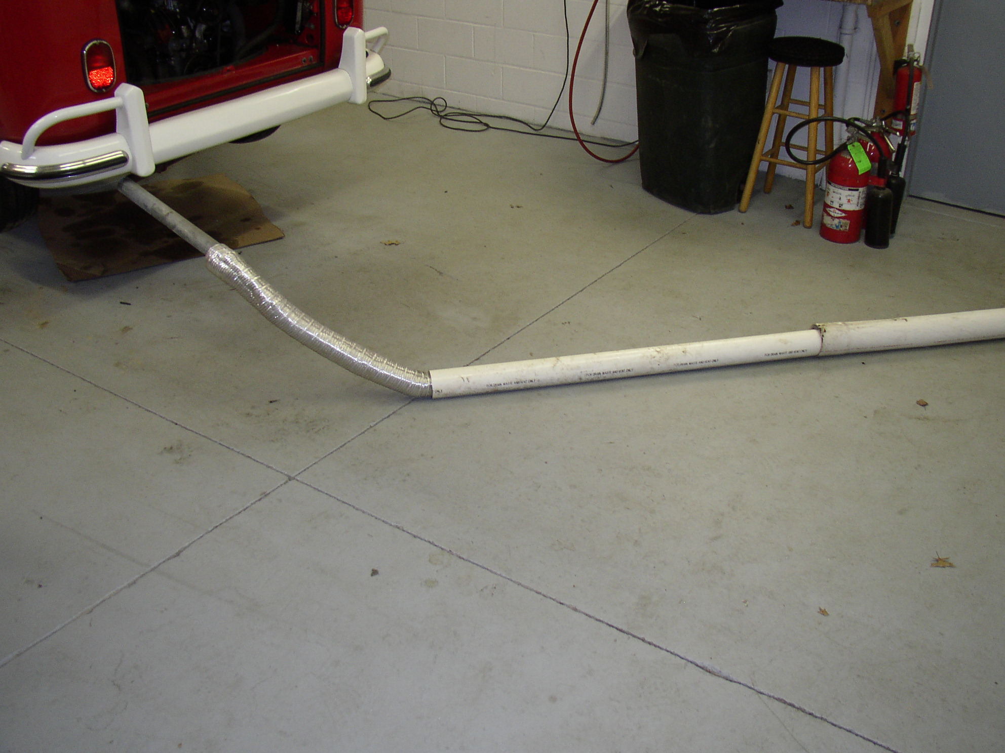 I resealed the heater box/muffler connections and one flange that was seeping with muffler sealer and drove it a bit on a dry day last week. I also made a new tailpipe using tubing eliminating the somewhat restrictive damper pipe. I now have absolutely no muffling of any kind as the baffles have been cut out of the muffler and no damper pipe, and noise is only slightly louder than stock from inside the bus. (1904 needs to breathe) Still smelling just a hint of exhaust I extended the tailpipe a bit in case I wasn't clearing the bumper. Note how much the pipe discolored on a 5 mile test drive from all of that whopping horsepower.