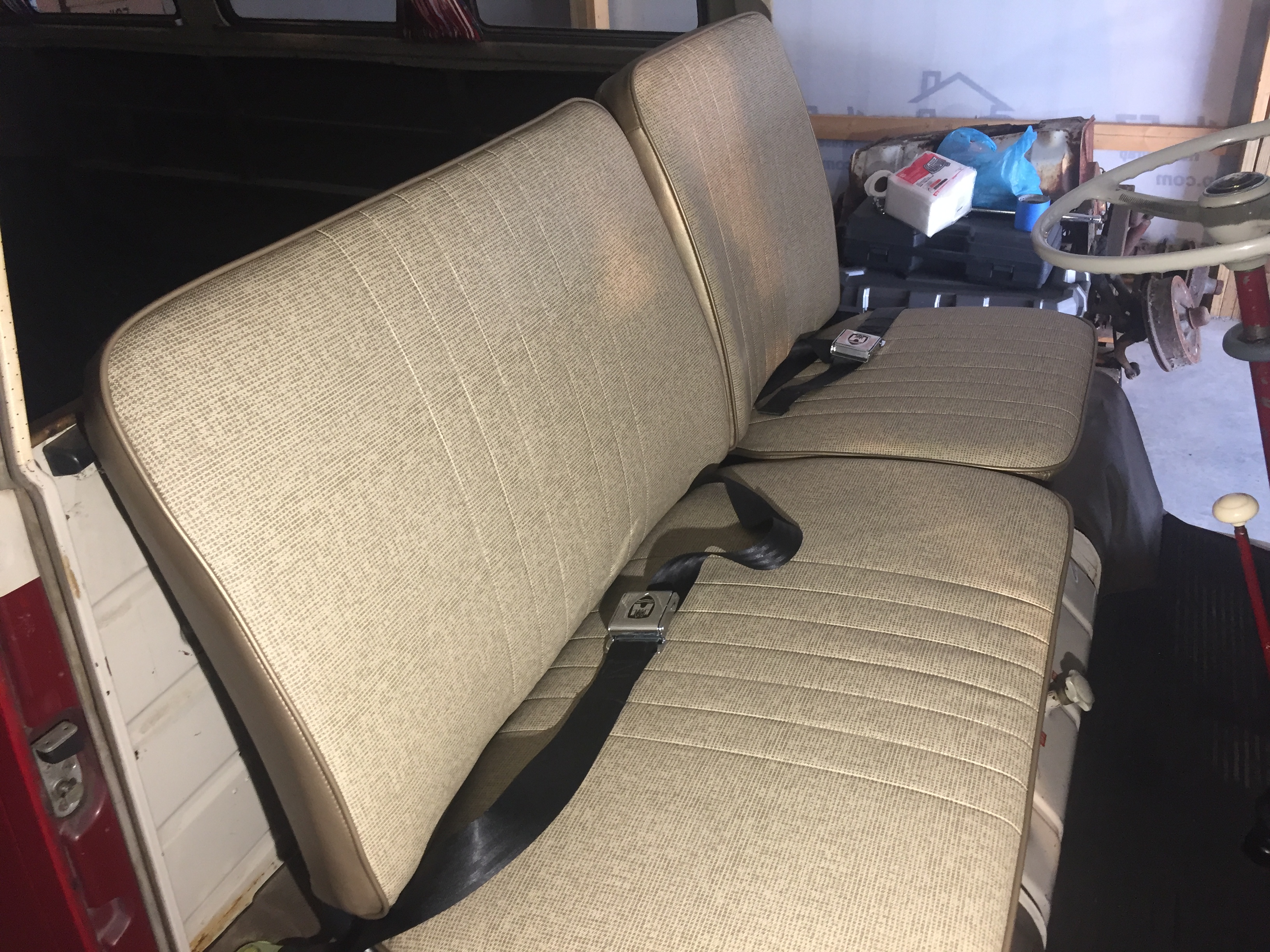 I figured while the bus is sitting around at Aaron’s shop, that it was time to get started on an interior project. First step was to strip the middle seat I had in the garage and get that over to Bruce’s shop to weld it back together.