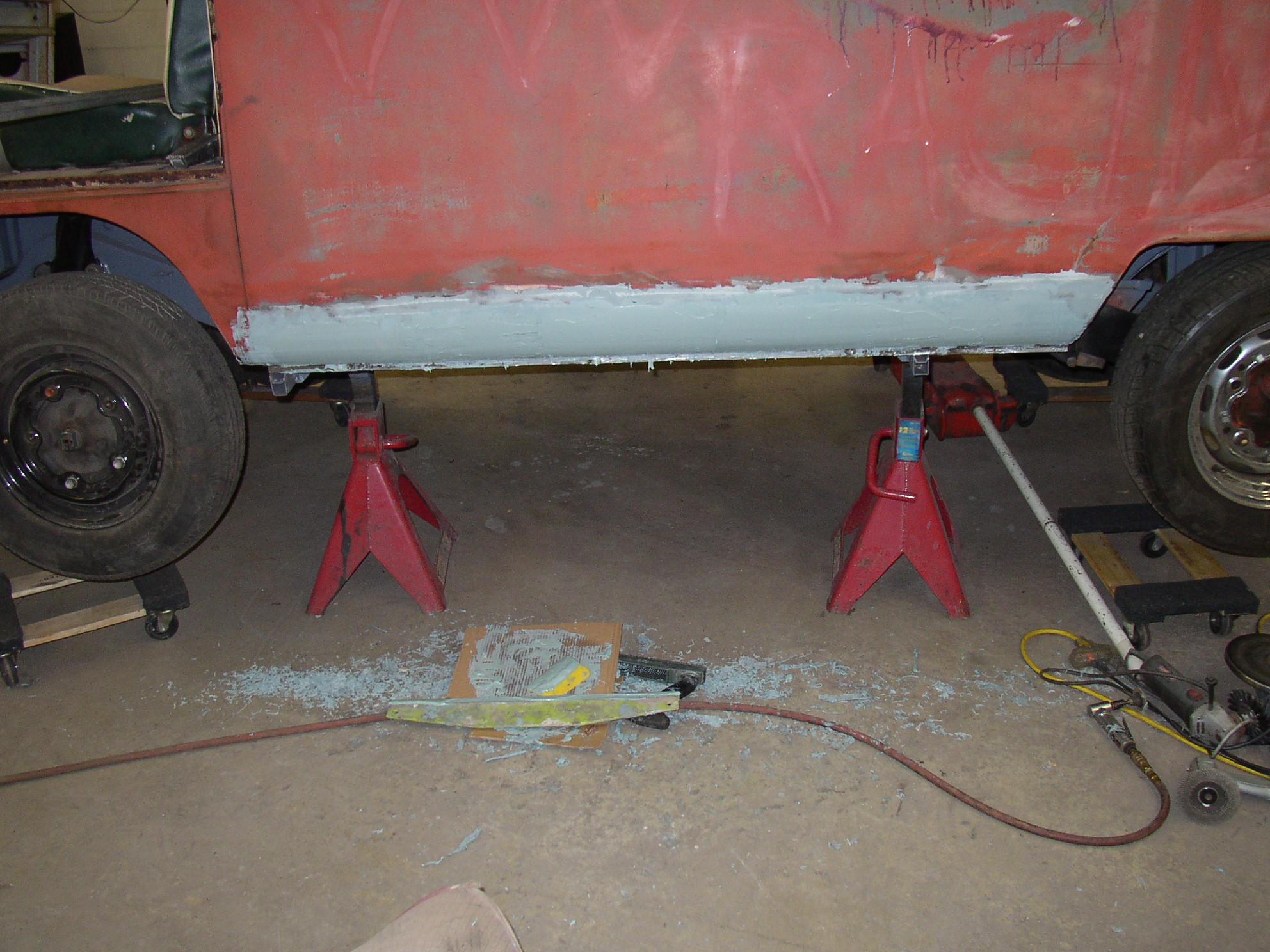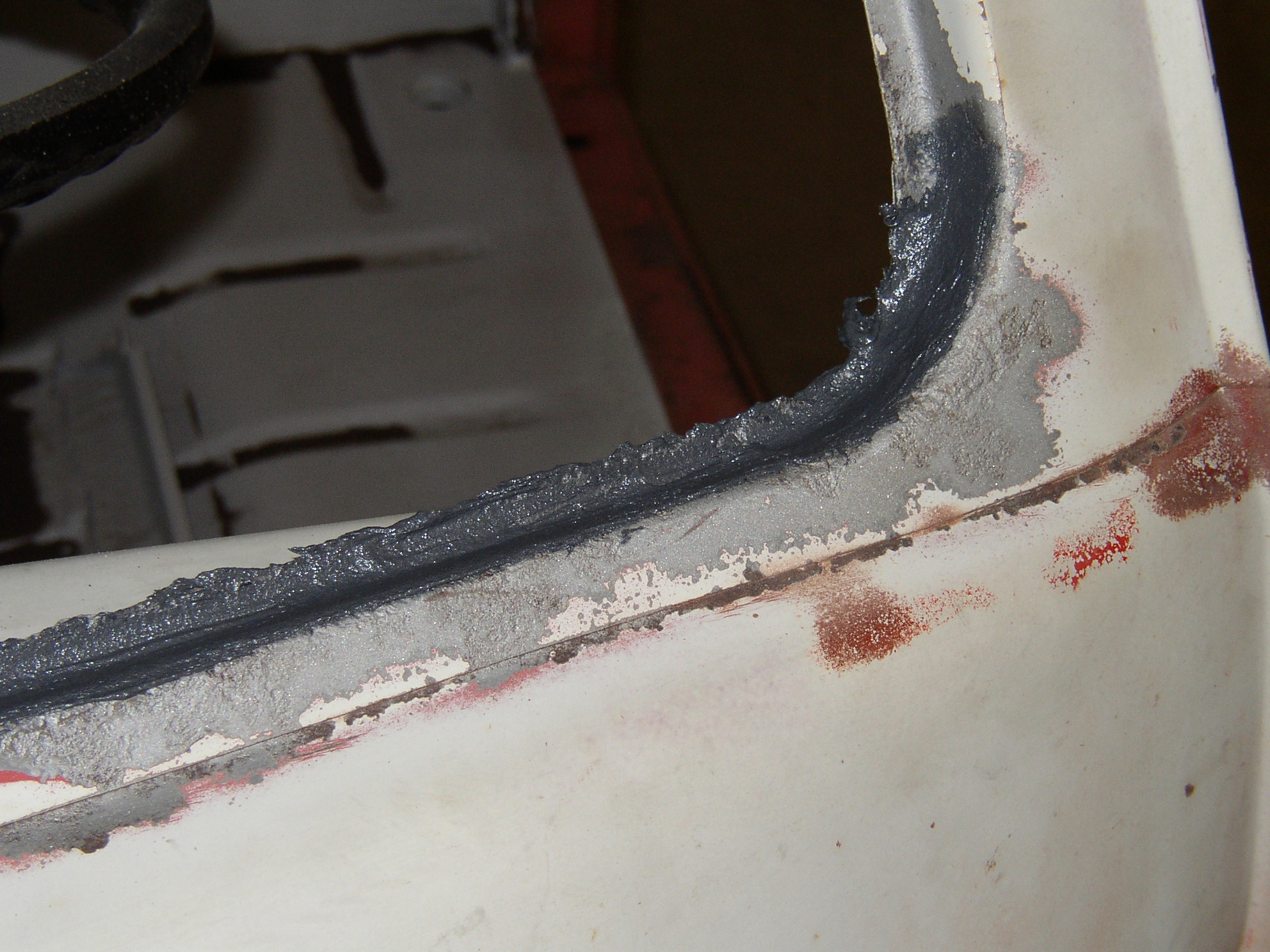 Wow, back on Bus 2 which hasn't had any love for quite some time. I sandblasted the window frames to get rid of the crust there and see how much rot there is. Luckily, very little, only a couple of pinholes, I thought I had good pictures of that but I can't find them. Here's the windshield frame after sandblasting and putting some epoxy paste on to fill the pits, pinholes, and build up the rough inner edge a bit.