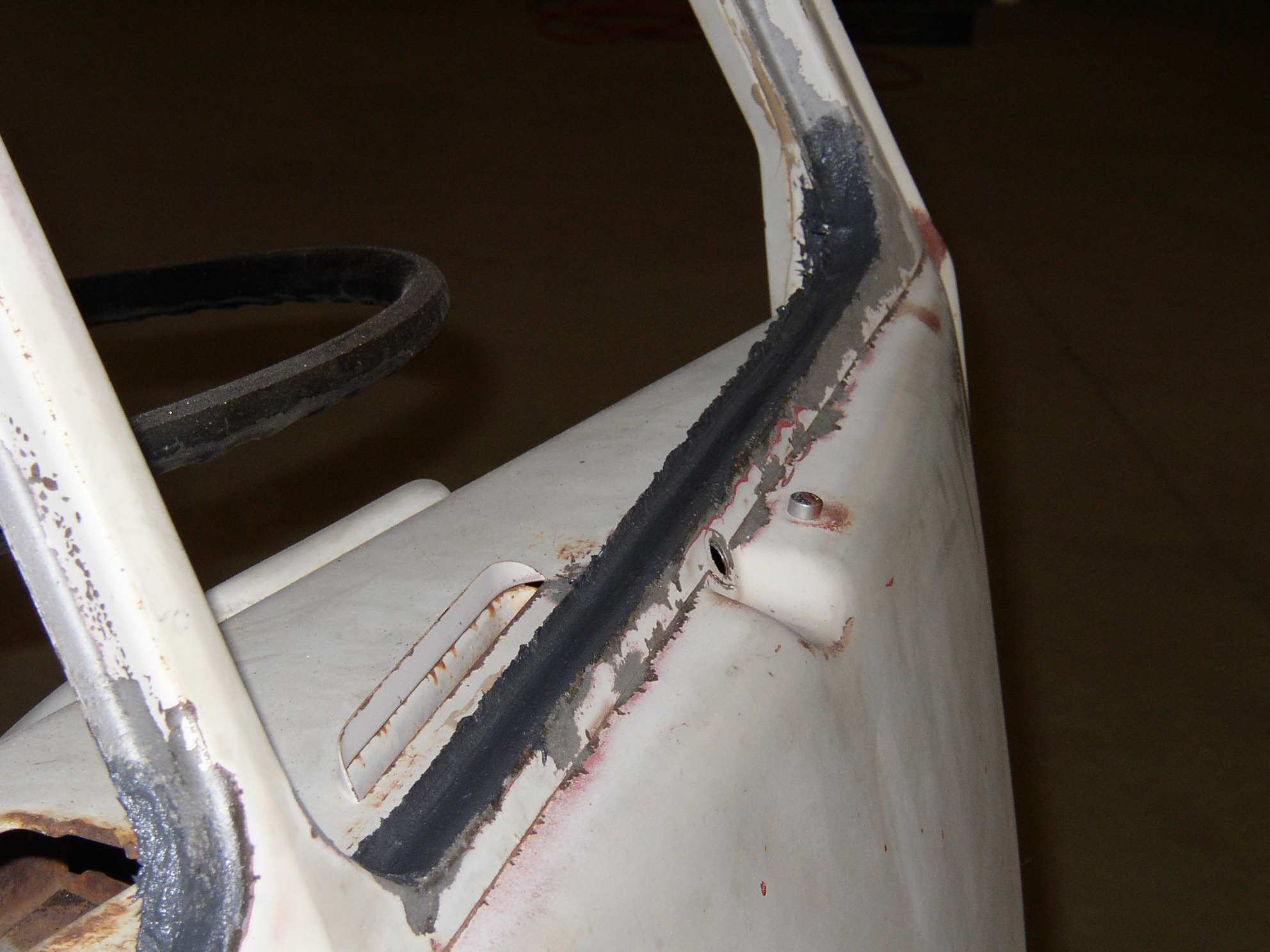 The front cargo door was a mess. Some moron in a previous life had torn the popout window hinge from the door and glued the whole f'ing window back into the door with some kind of high strength glue or epoxy. It took some real muscle and finesse to pry the window out without breaking the glass or doing massive damage, but in the process the window frame got twisted by the glue. There was no real solution for this as it came apart. The window frame was mucked up and needed pulling out but that's not easy.