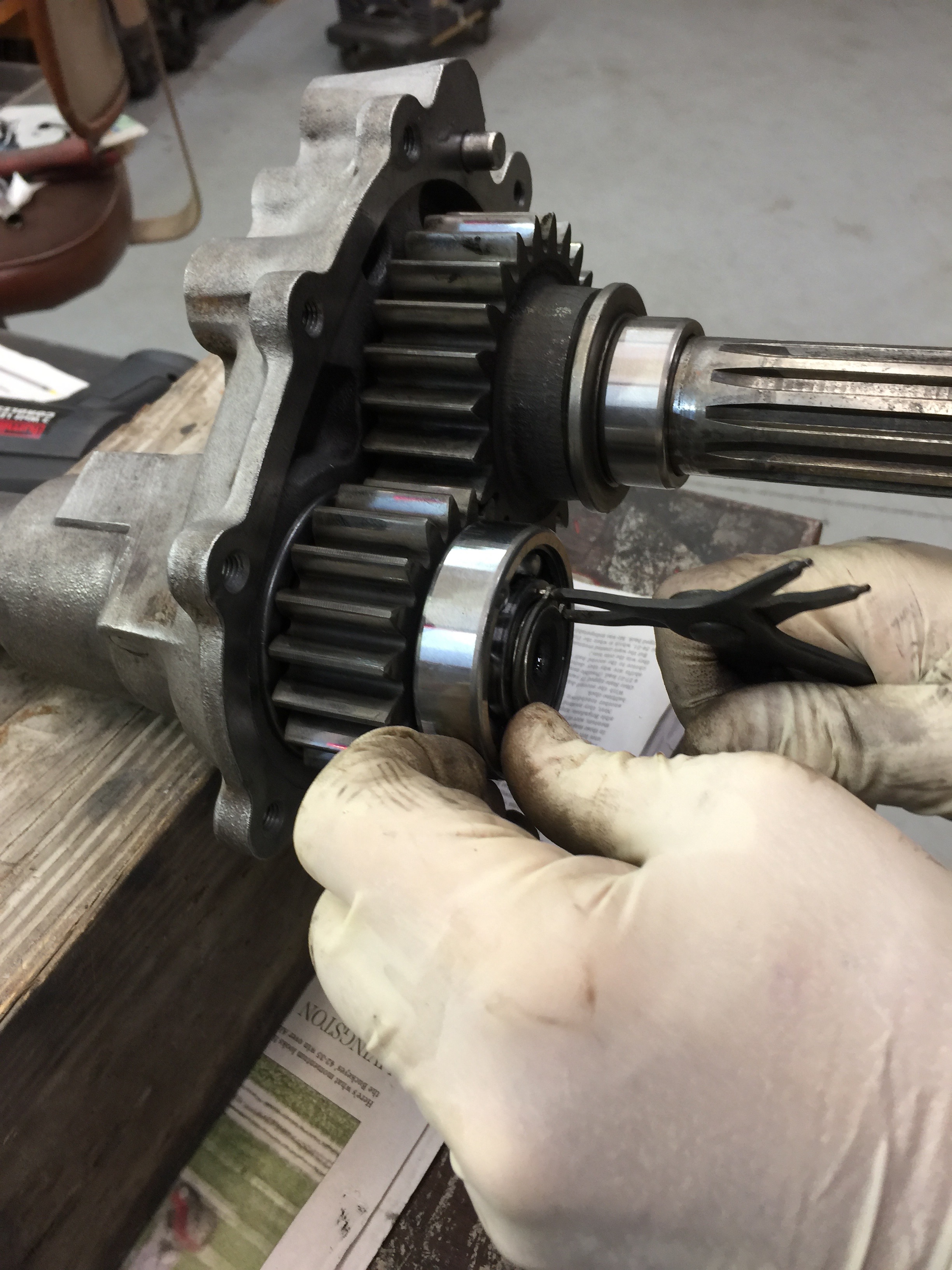 If you do this, you'll learn about wear marks on the axle paddles and the fulcrum plates. Bruce swapped mine around to get a better surface. He taught me how to make sure the axle and fulcrum plates don't disengage when you're putting it together. You'll learn how to get the one piece (aren't they all one piece?) axle boots without the separation and screws onto the axle tubes using a little heat and persuasion. You'll also learn about the spacer and c-clip that goes "inside" the tranny hole (left and right) and then the plastic "hat" that goes over the opening before the axle tube goes on. You'll learn about the virtues of RTV silicone when mounting the axle tube to the transmission housing. On the other end you'll learn there are inner and outer axle bearings as well as inner and outer stub bearings. And the inner stub bearing has an internal nut that has to be torqued to 108 ft. lbs. and has a raised edge that has to be pinched. More c-clips will follow and the outer housing of the RGB case can be installed following the two dowel pins as a guide.