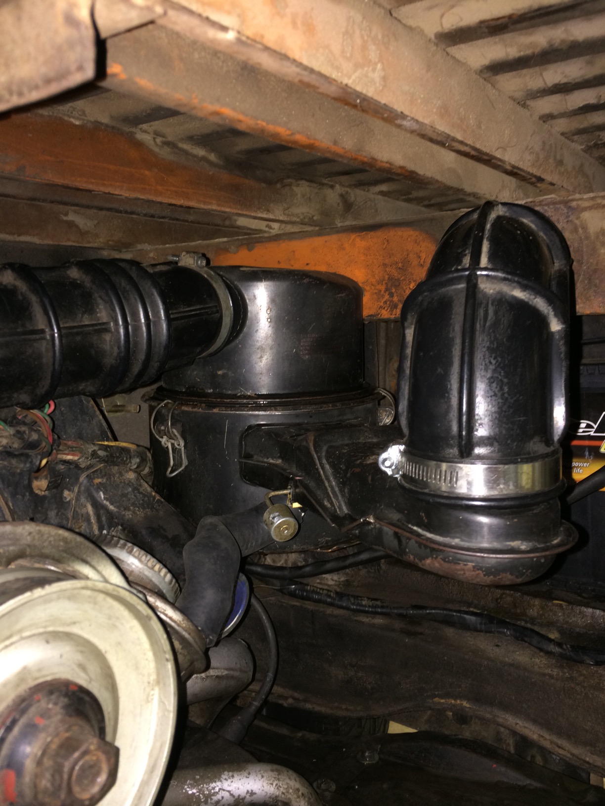 Here is the air cleaner reinstalled with it's new/used clips and flap. The breather hose to the oil filler neck was missing and the closest one I could find at the local auto parts store was this radiator hose. The original must has been preformed with a bend in it. It has to make such a sharp turn at the fan shroud hose outlet that it kinks, so still looking for another solution there.
