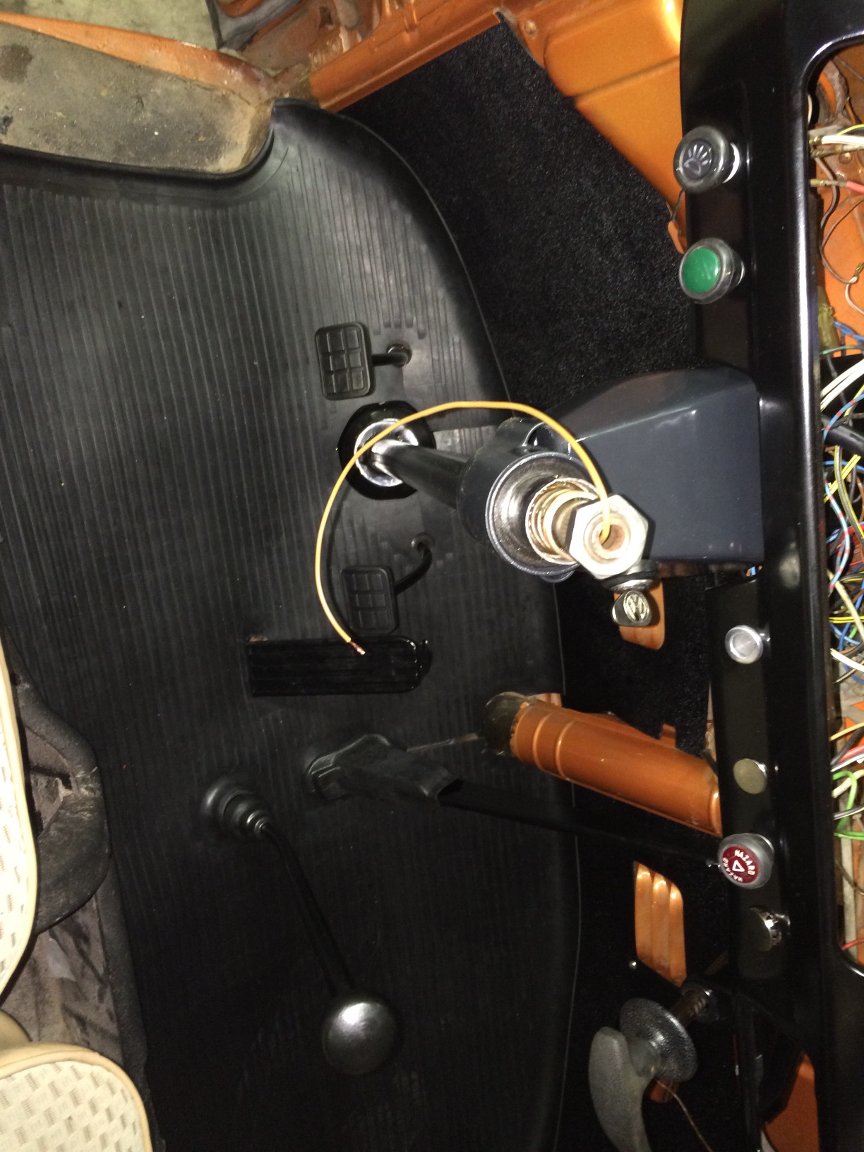 Replaced the steering coupler last night so I could mount the steering column and ignition housing. Ran new wire for the horn which had been missing. Finished hooking up the emergency brake and put in the new floor mat. Still a lot of wiring to do. Ignition, emergency flasher, turn signals (not hooked up in photo) and headlights all work. Cannot get the taillight or brake lights to work yet.