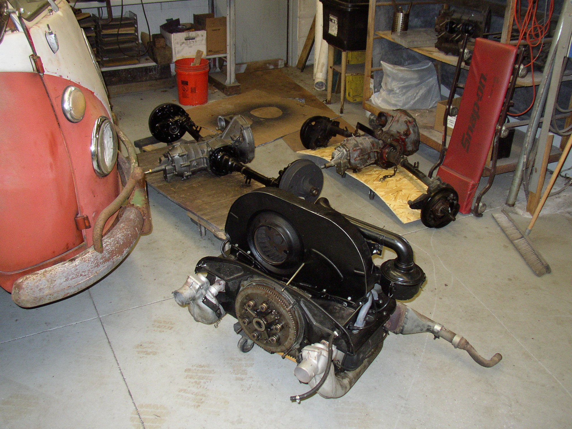 Here's the bus with the driveline removed And the drivelines on the floor. Out with the small nut, in with the big nut. Here's the shit gas that was in his tank, I'm not sure if it was from crap in the tank or a bad gas station he bought from, but it was bad! It should be clear like apple juice, you should be able to see the bottom of a white bucket .