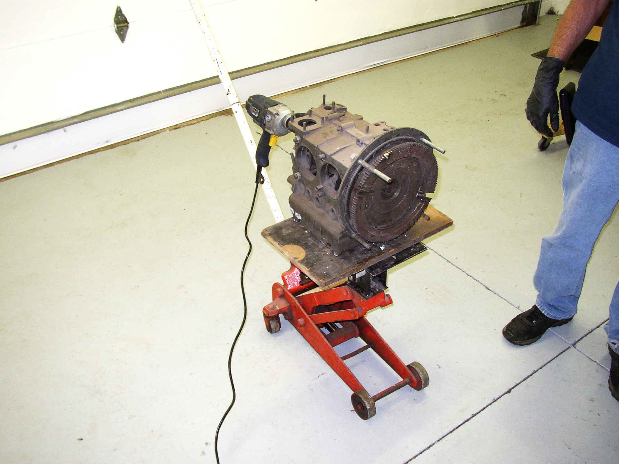 Using a low speed 1/2" drill slowly insert it into the bellhousing. The drill does have a left side handle which doesn't show in the pictures. I told Ken his job was to watch and take me to the hospital if things went wrong.