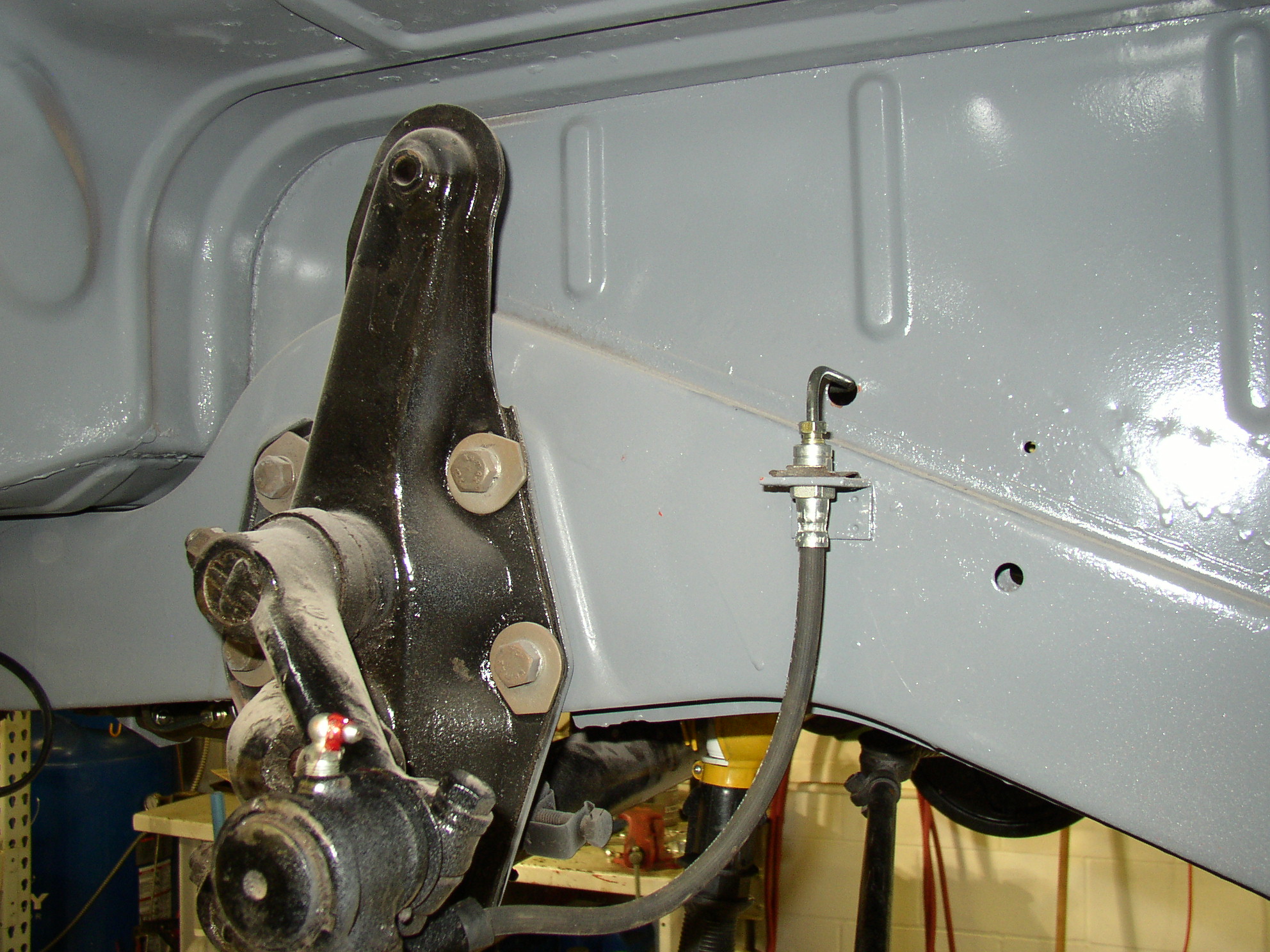 connect the hose to it.. ..... Then tighten it down. It's much harder to start the fitting when it's already in the bracket. This is another place where the 'spensive wrenches pay off- good line wrenches don't flex like cheapie line wrenches. Don't forget the rubber grommets and horseshoe clips.