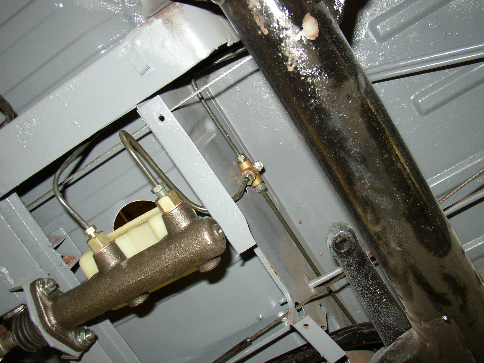 Run your lines now, and you'll need another tee fitting near the MC to feed the front lines since there's only one front outlet rather than two like most have. Yes, the line goes through a grommet. I could have wired the brake light switches in parallel but I didn't see the need. The second switch is a dummy/bad switch I had on the shelf.