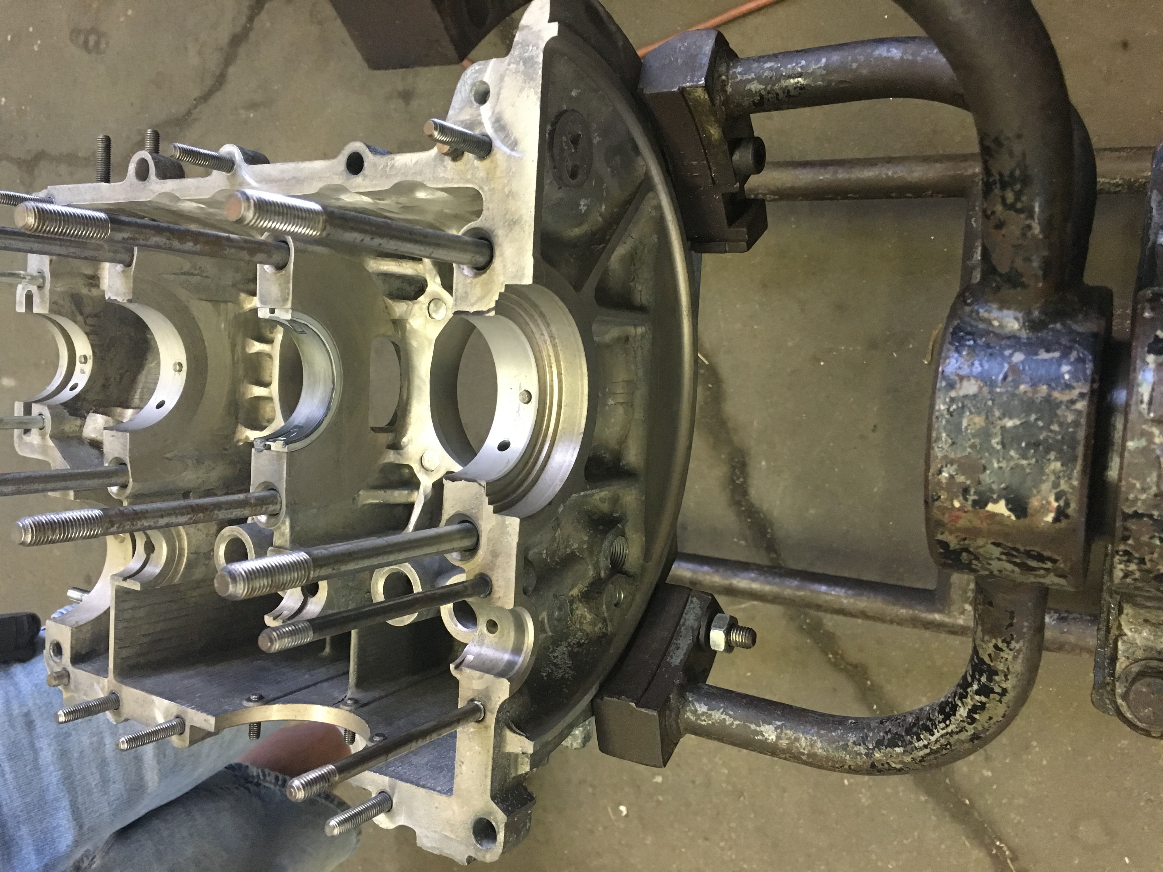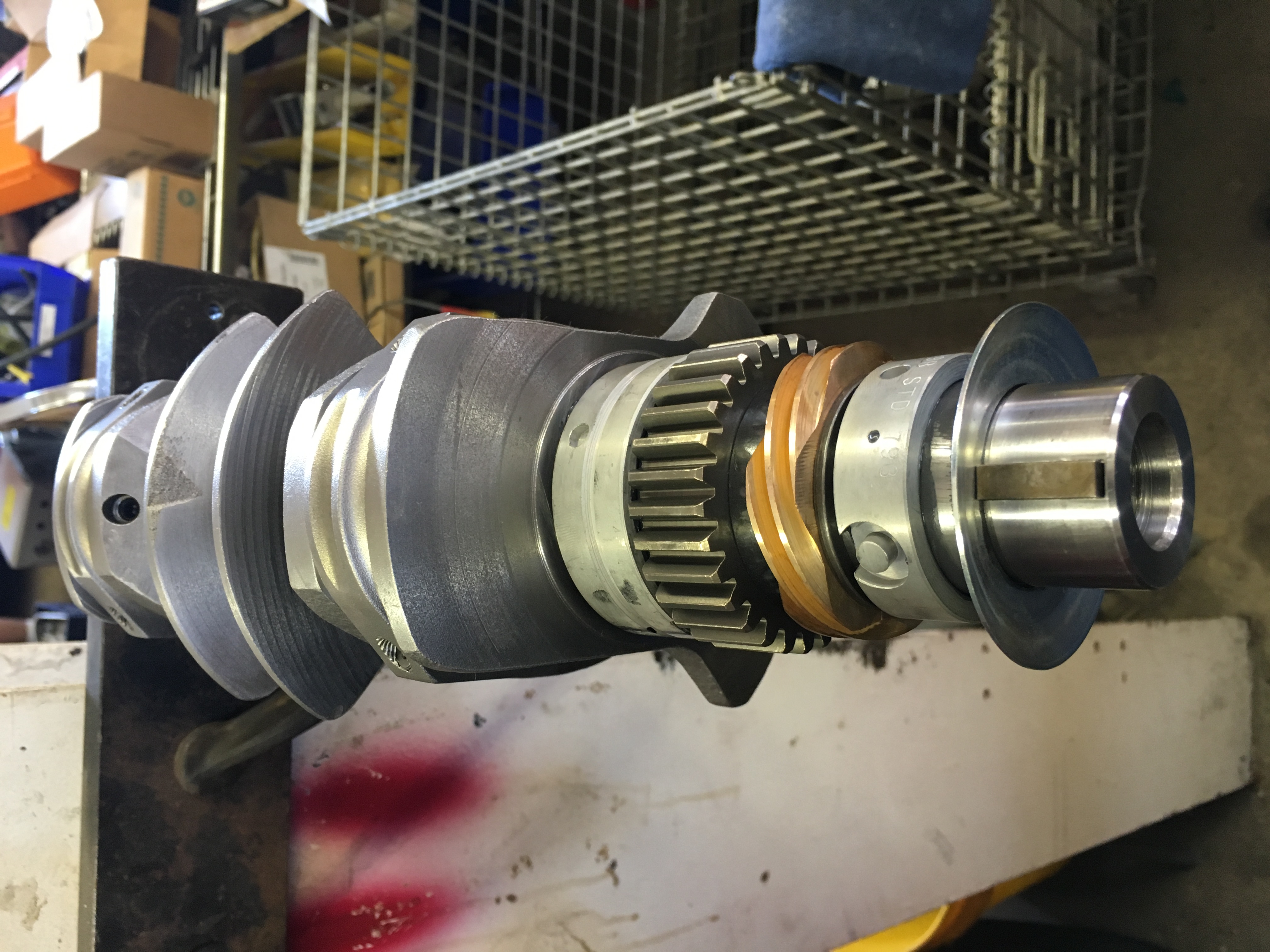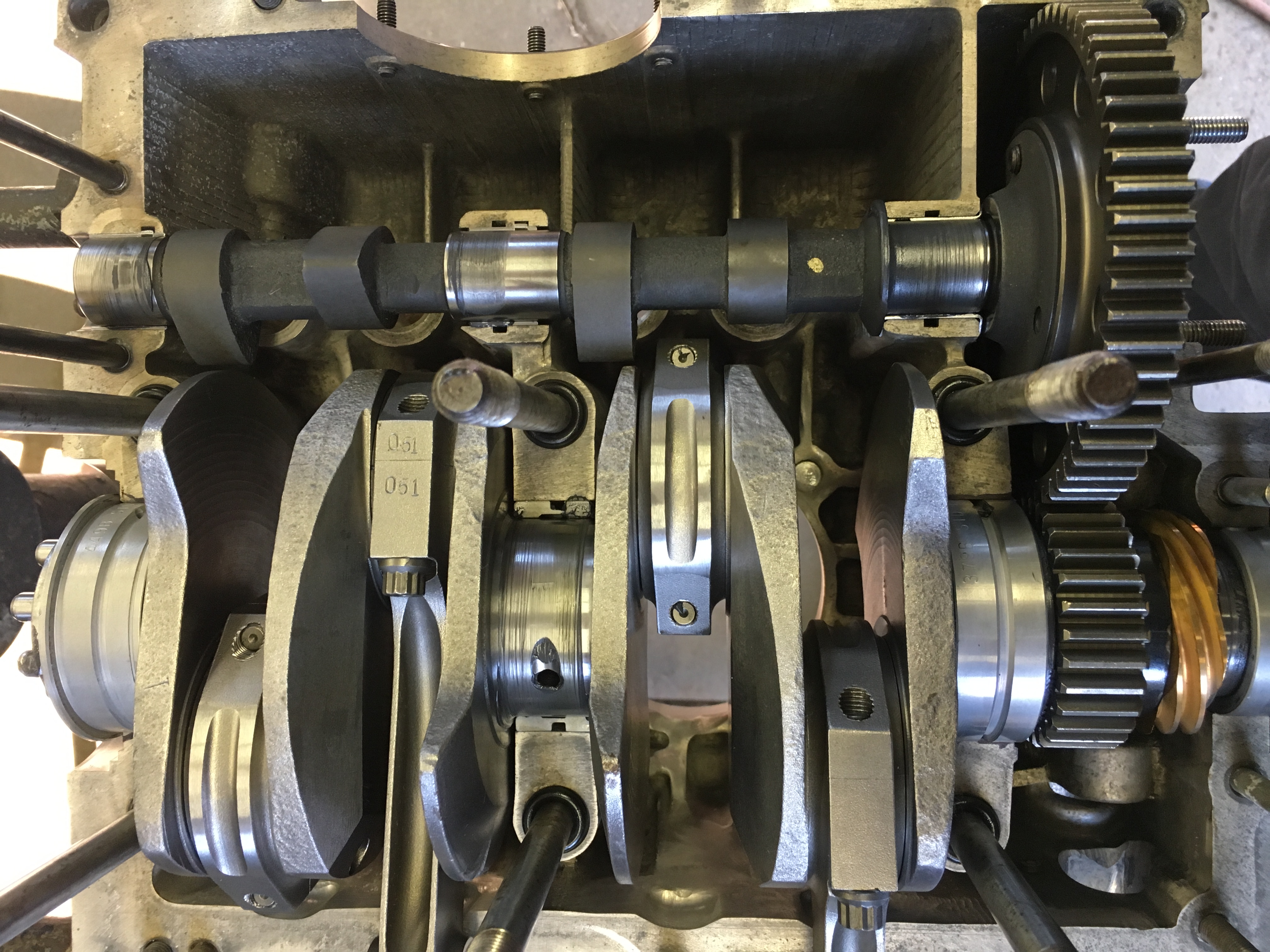 Crank finshed off with bearings, cam and timing gears, and oil slinger.