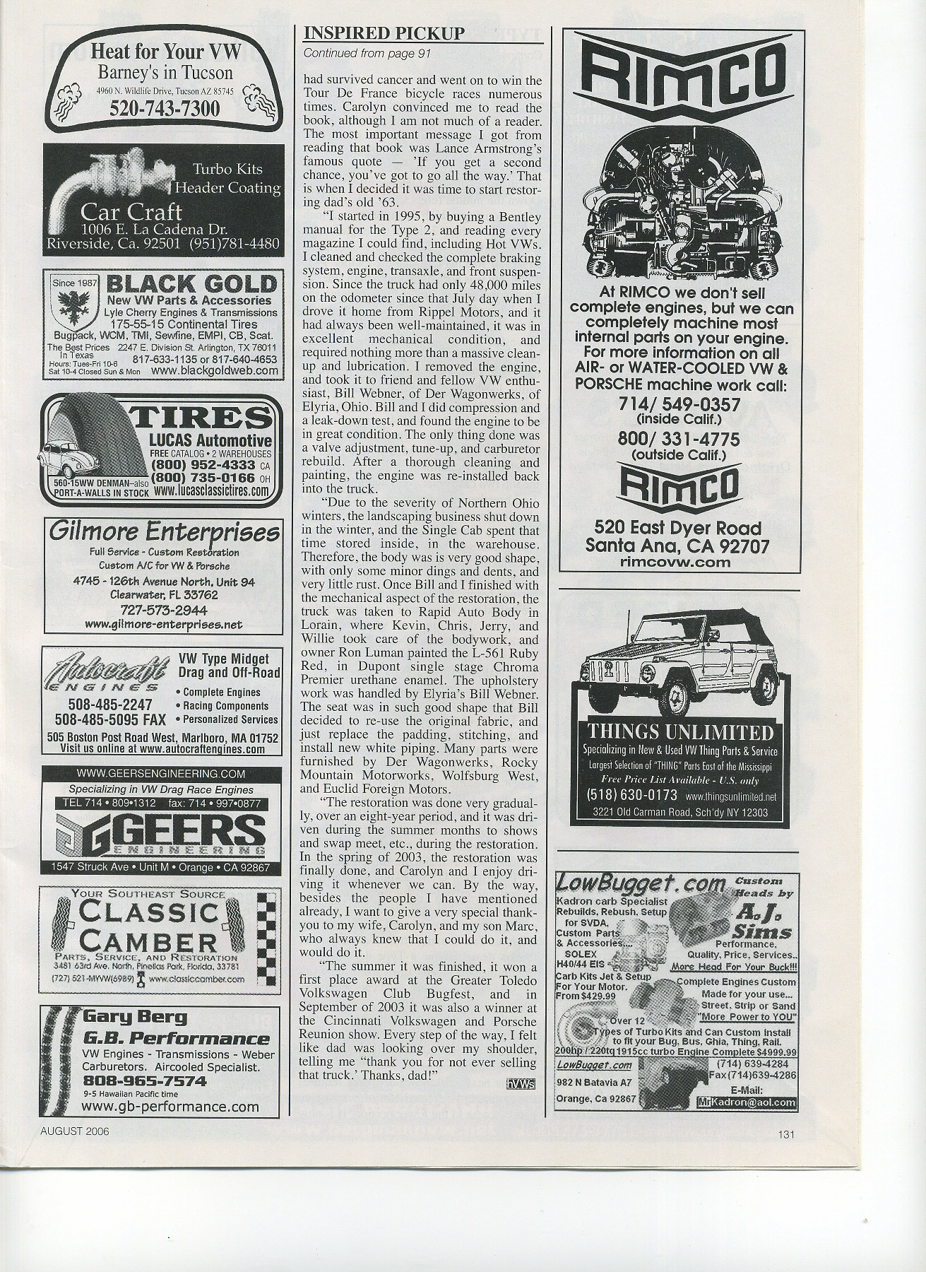I met Dave Cormack of Hot VW's Magazine at the Porsche/VW Reunion in Cinncinati in 2005. He asked me if he could do a photo shoot of the single cab. Of course I said yes and much to my surprise this article appeared in the August 2006 issue of the magazine. Below are some of the original service documents that came with the SC. Wish I had the sales invoice, I remember handing the salesman my dads check for $2340.00.